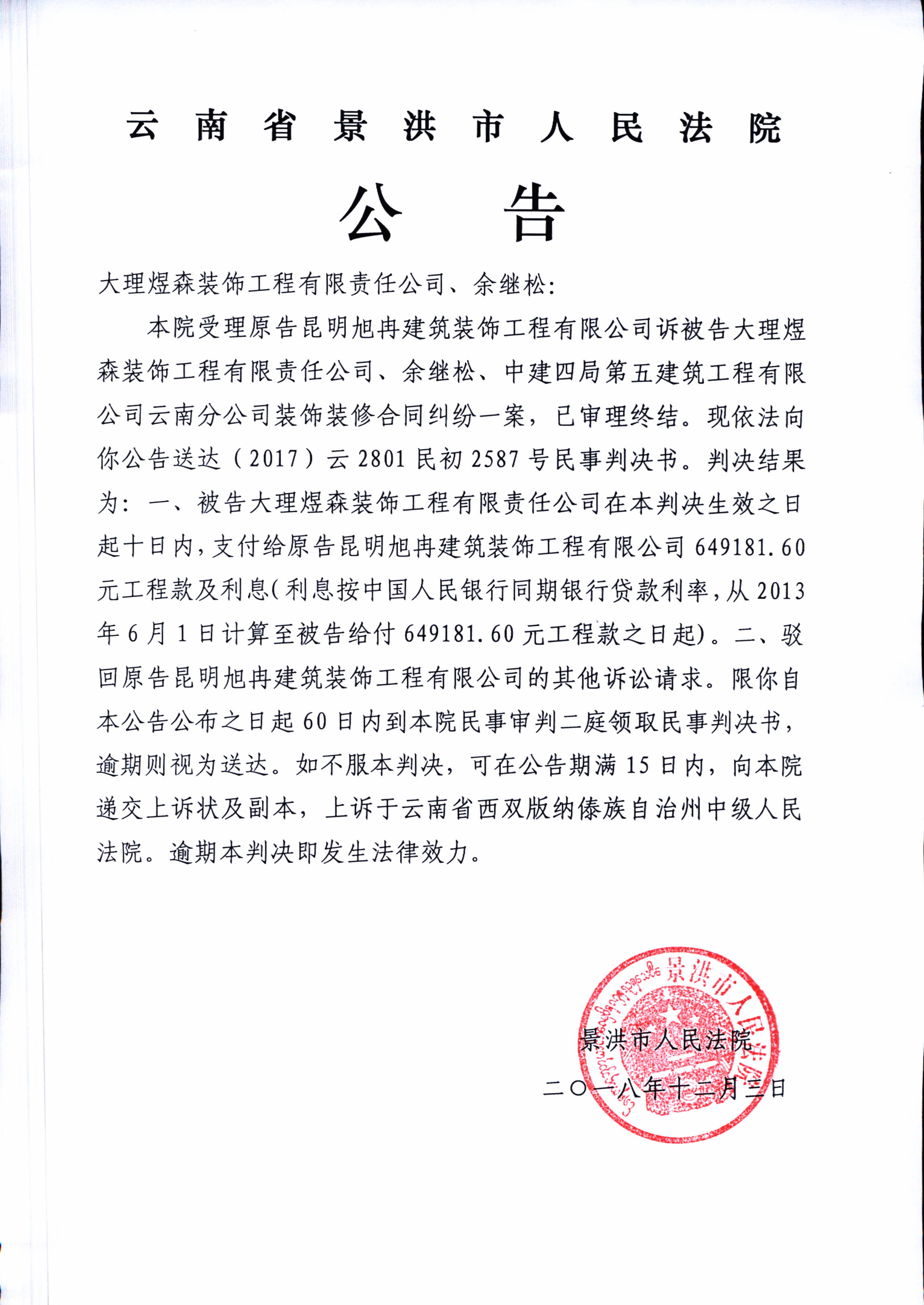 公告(大理煜森装饰工程有限责任公司、余继松)