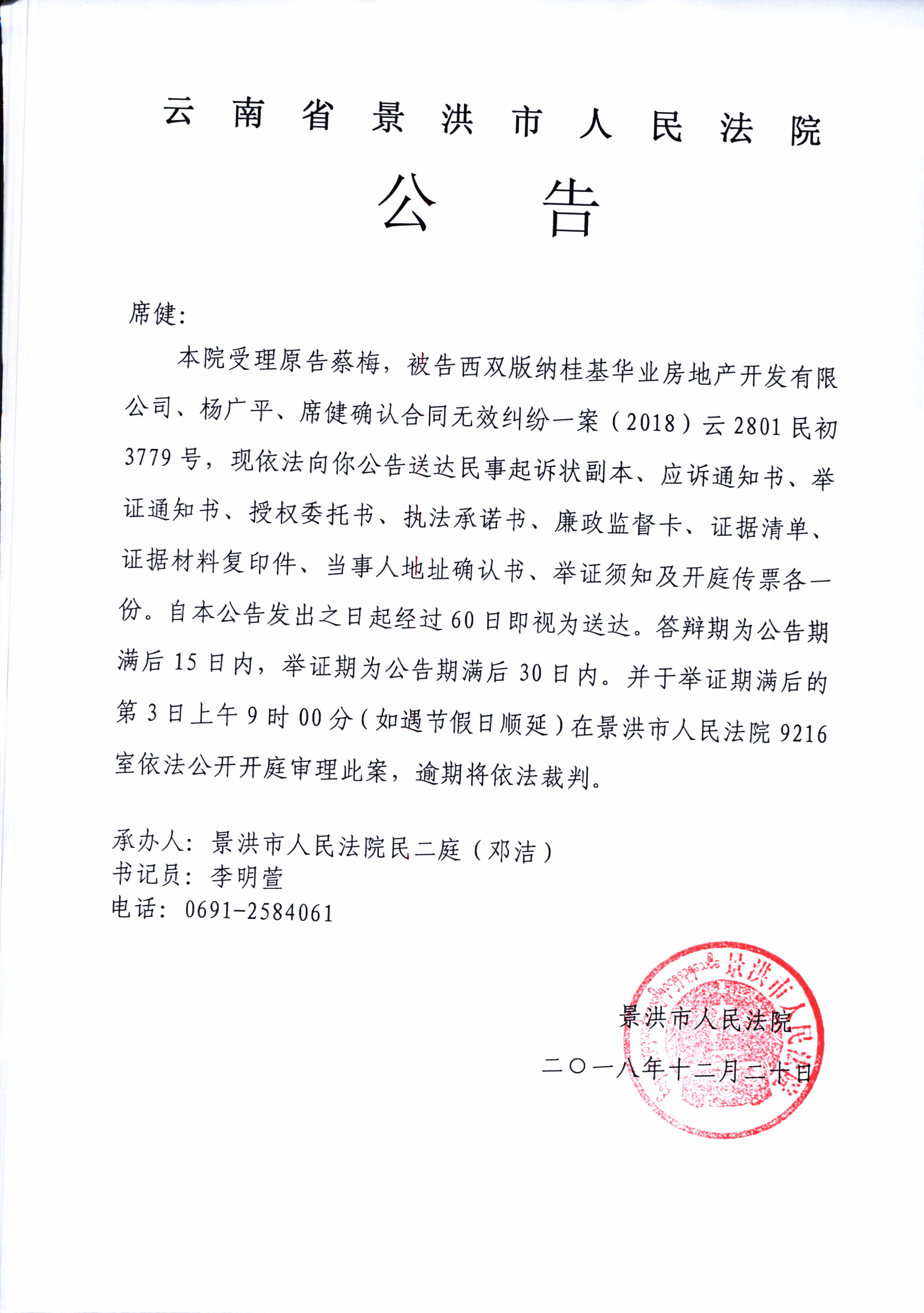 席健(2018)云2801民初3779号
