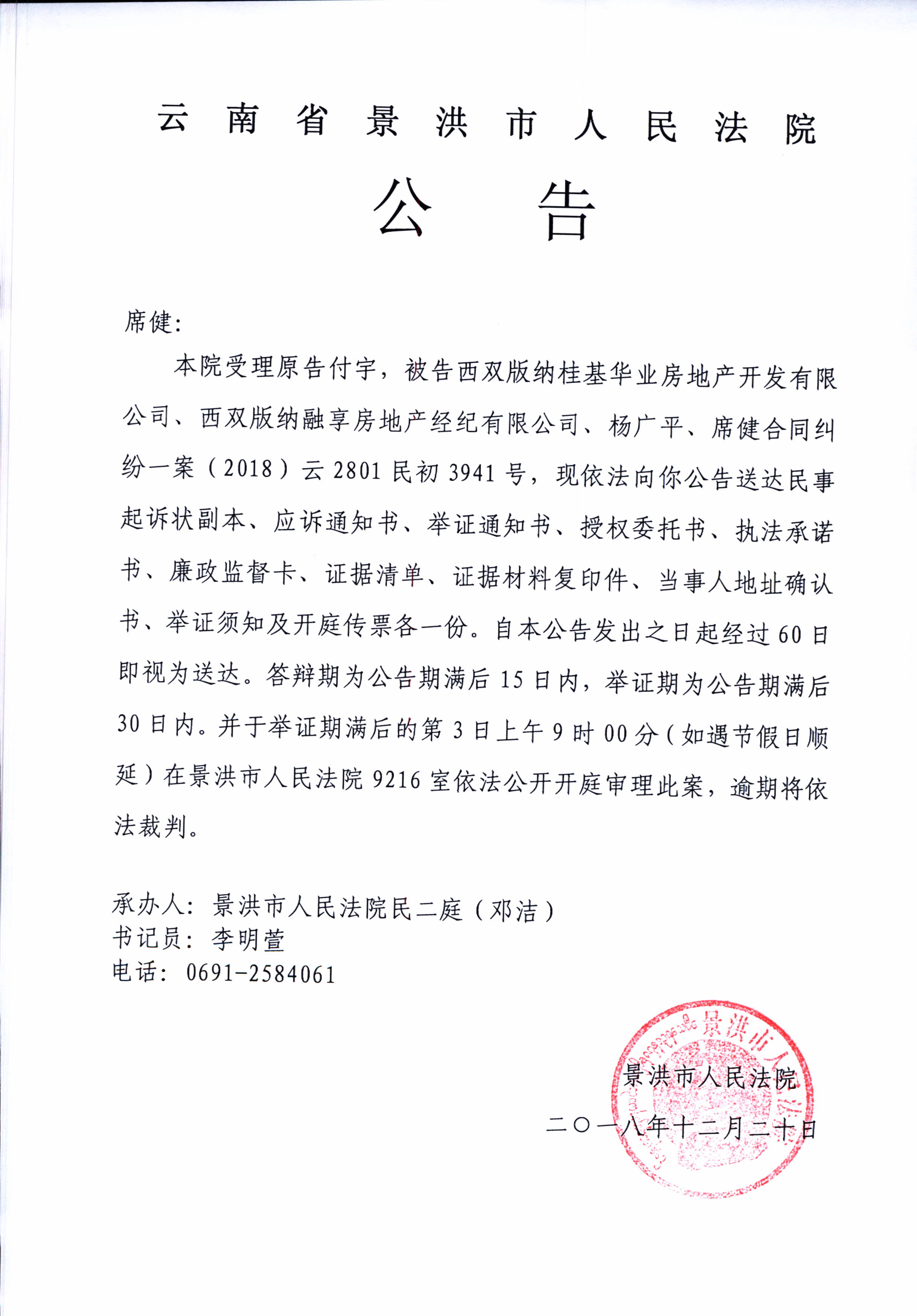 席健(2018)云2801民初3941号