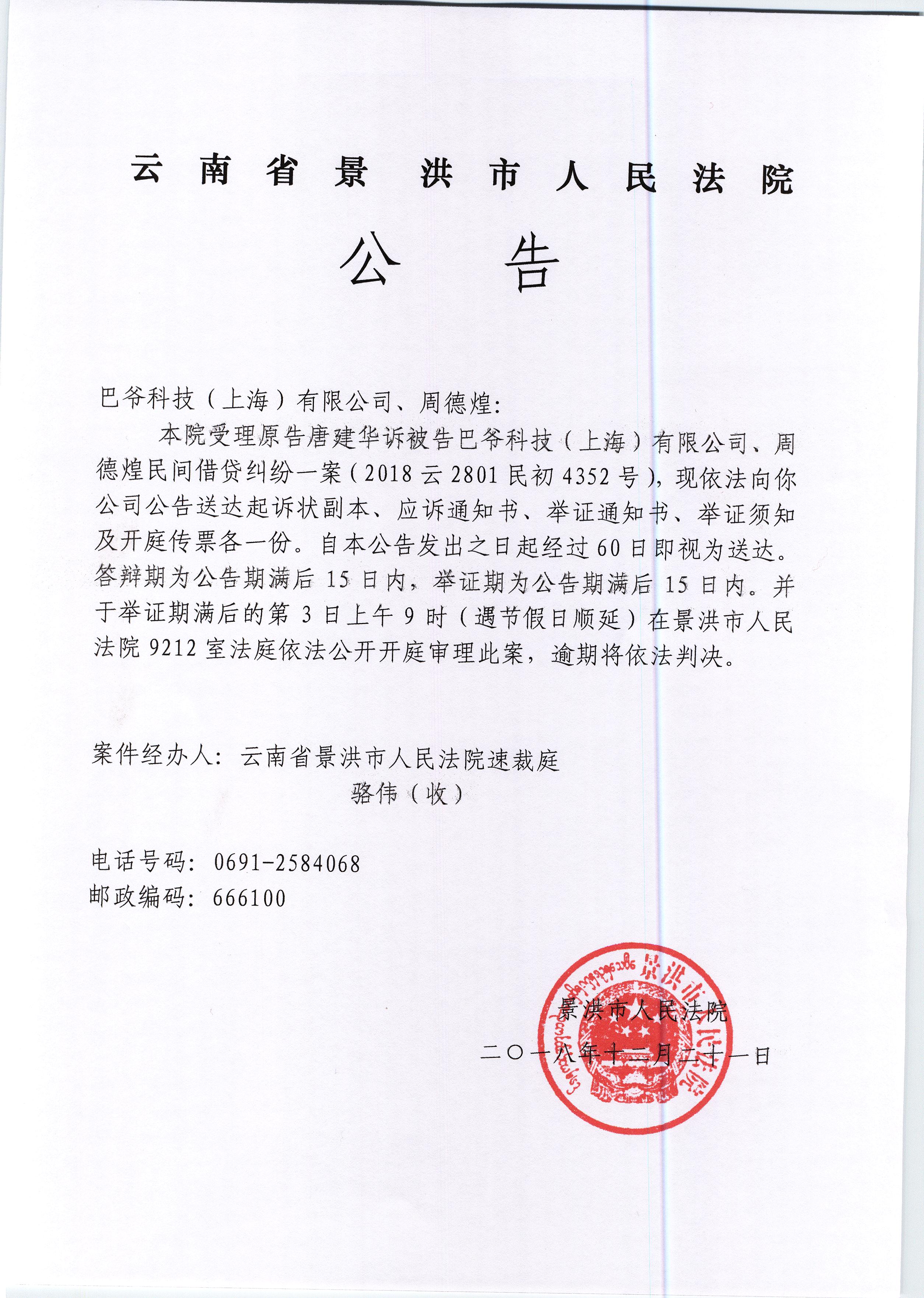 (开庭公告)巴爷科技(上海)有限公司、周德煌
