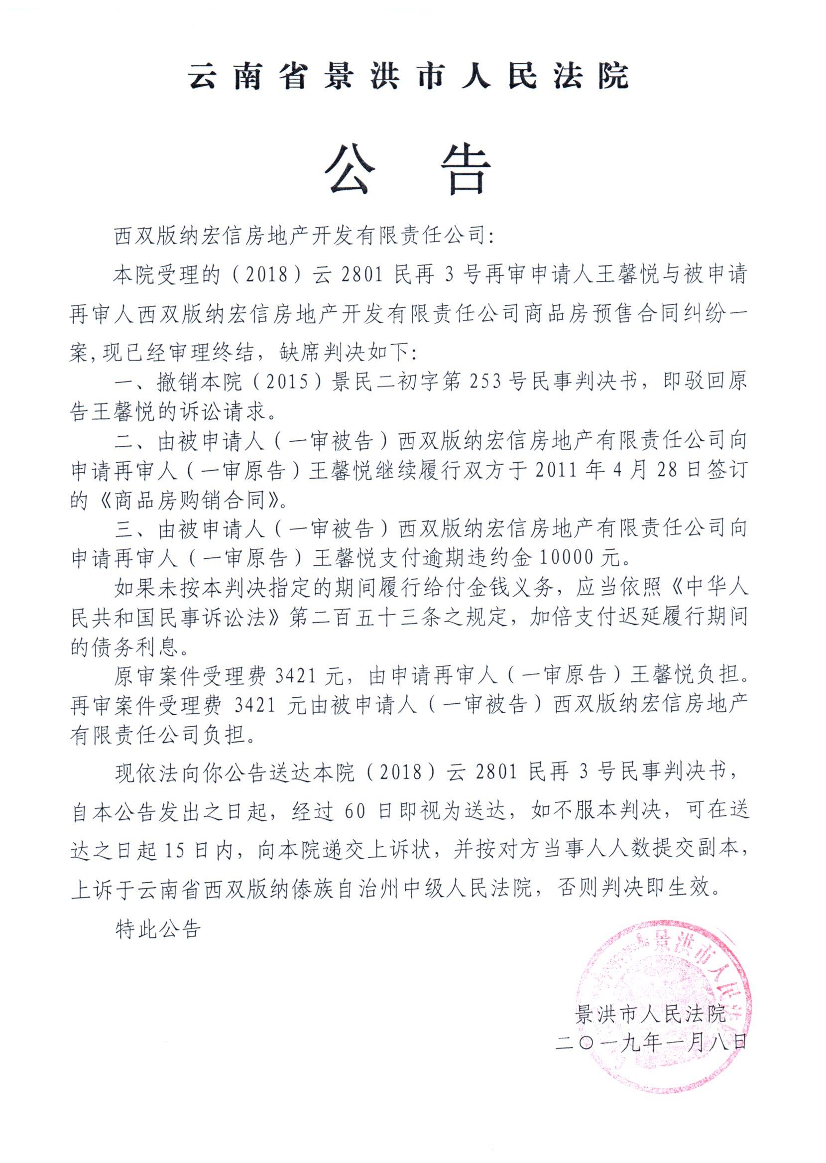 公告(西双版纳宏信房地产开发有限责任公司)