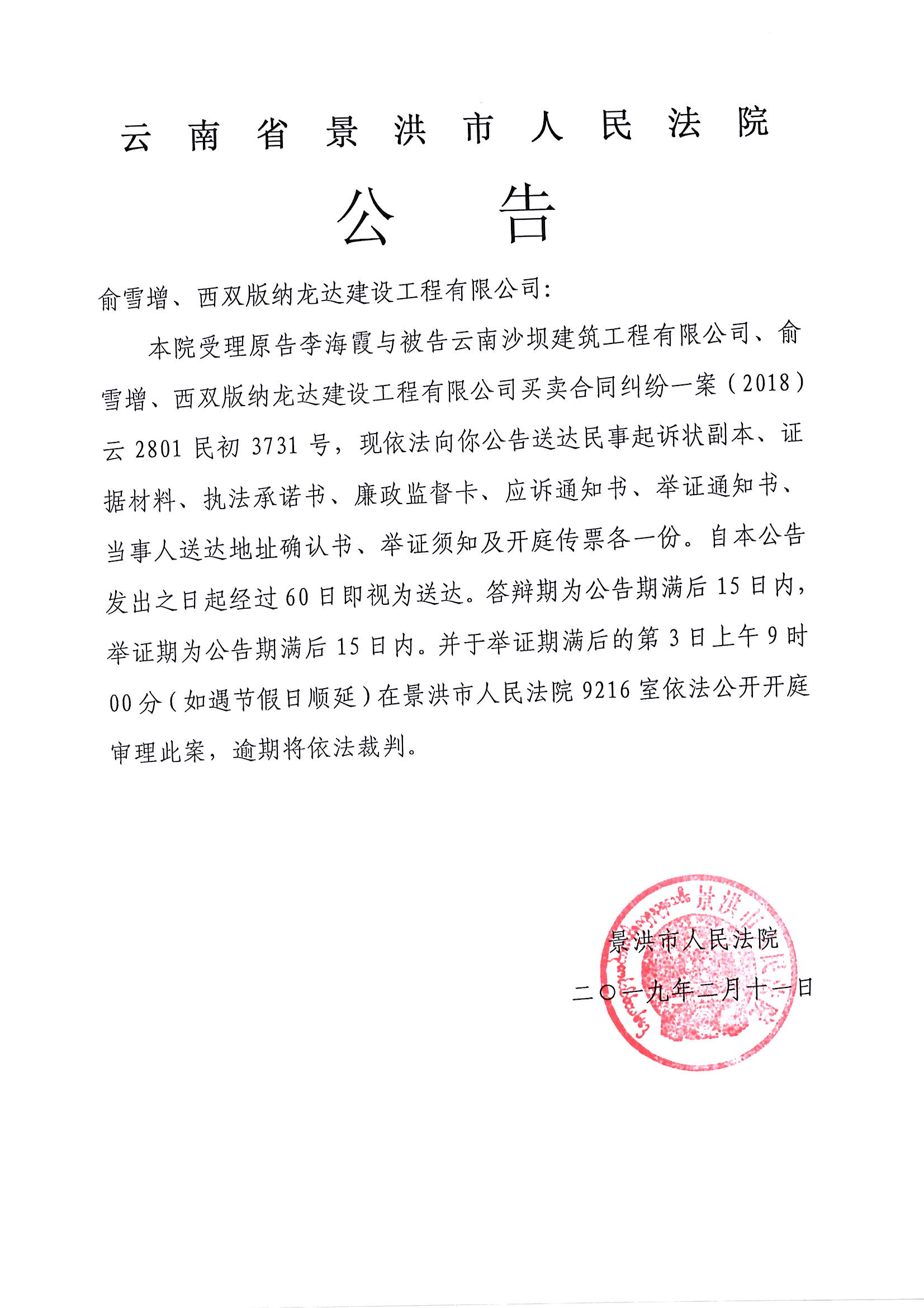 公告(余雪增、西双版龙达建设工程有限公司)