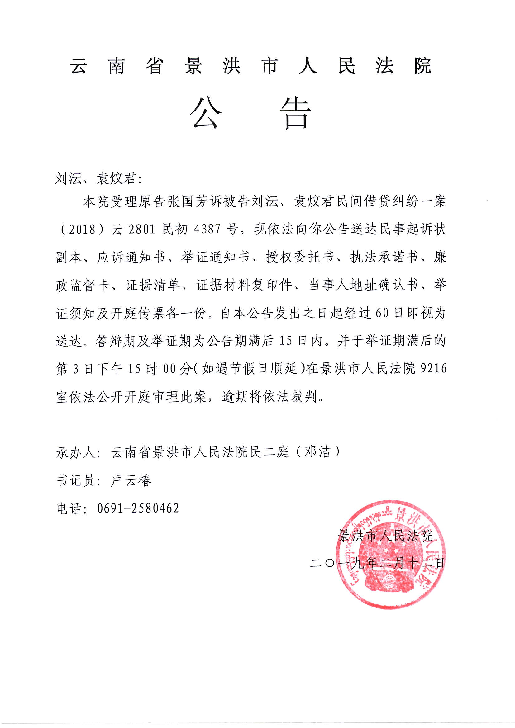 刘沄、袁炆君(2018)云2801民初4387号开庭传票