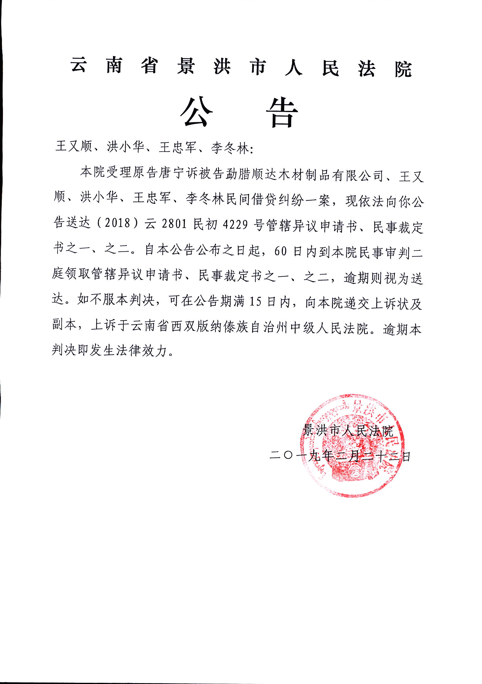 公告(王又顺、洪小华、王忠军、李冬林)