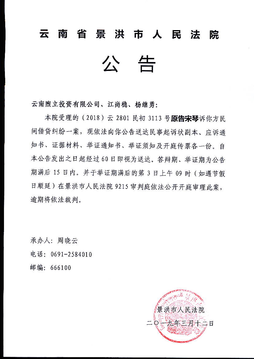 云南煦立投资有限公司、江尚稳、刘继勇(传票公告)