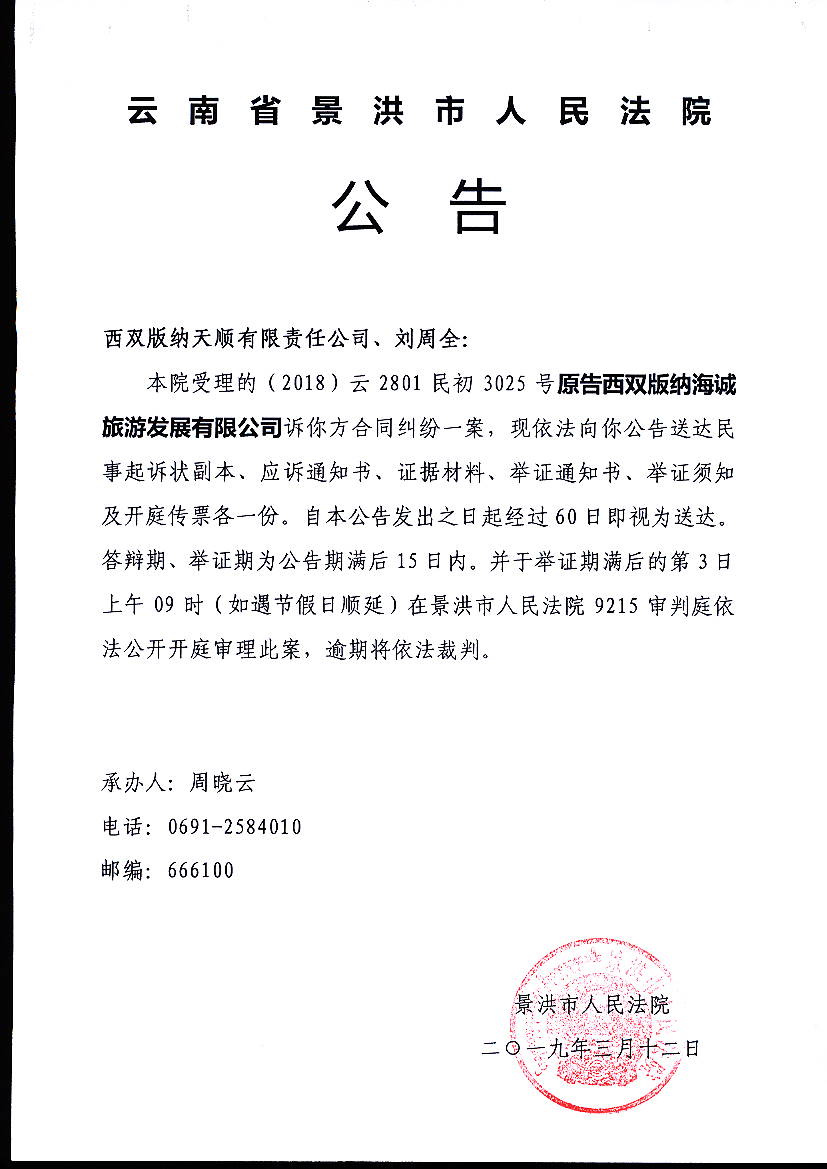 西双版纳天顺有限责任公司、刘周全(传票公告)