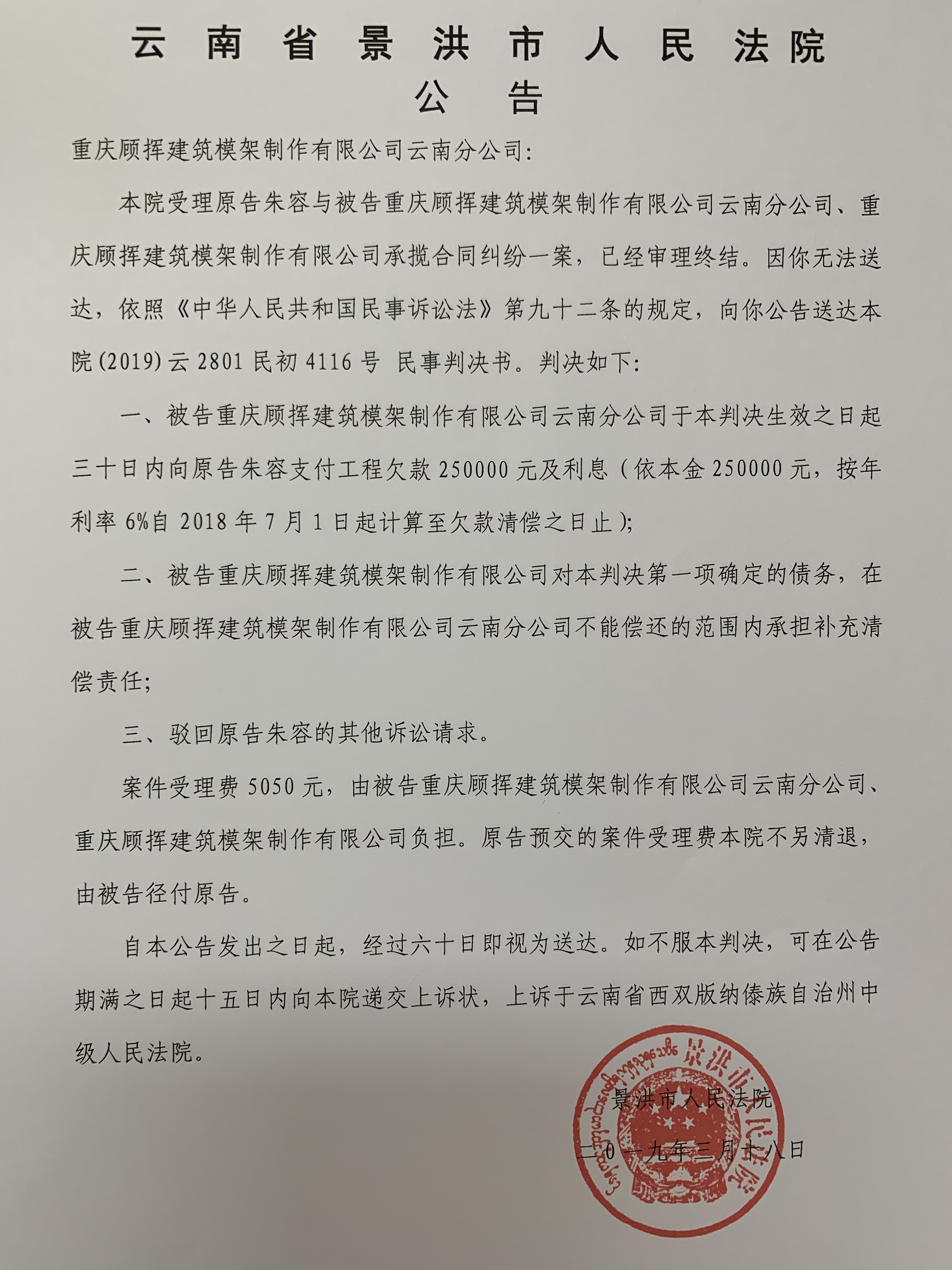 重庆顾挥建筑模架制作有限公司云南分公司(判决)
