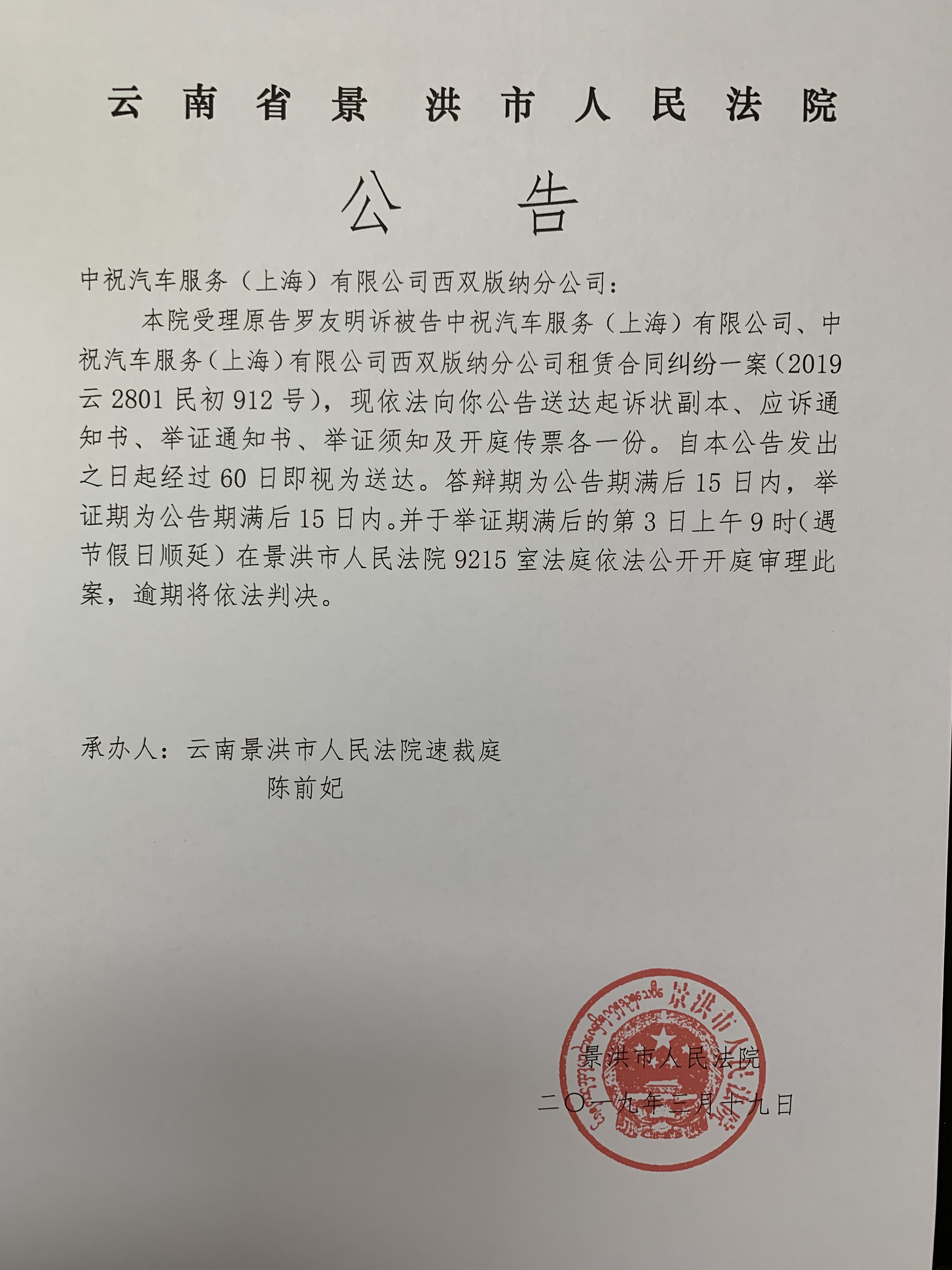 中祝汽车服务(上海)有限公司西双版纳分公司(传票)