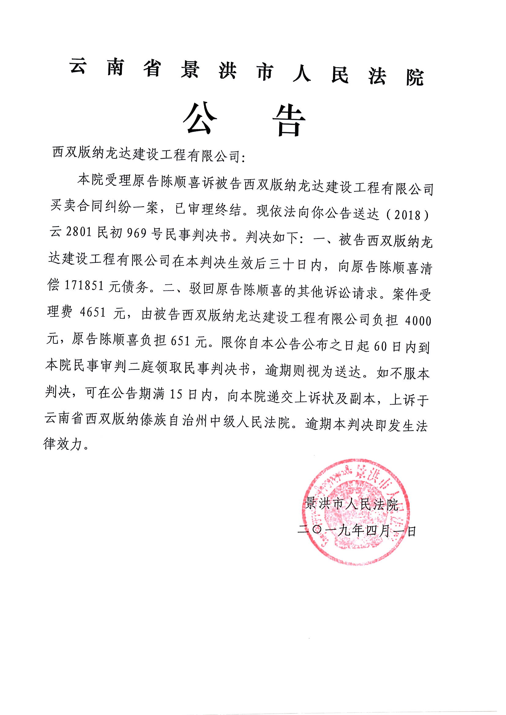 公告(西双版纳龙达建设工程有限公司)