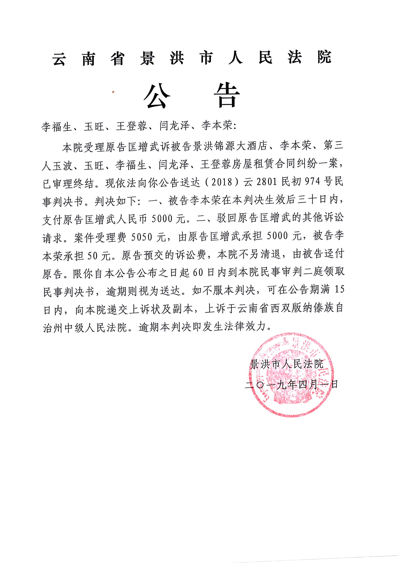 公告(李福生、玉旺、王登蓉、闫龙泽、李本荣)