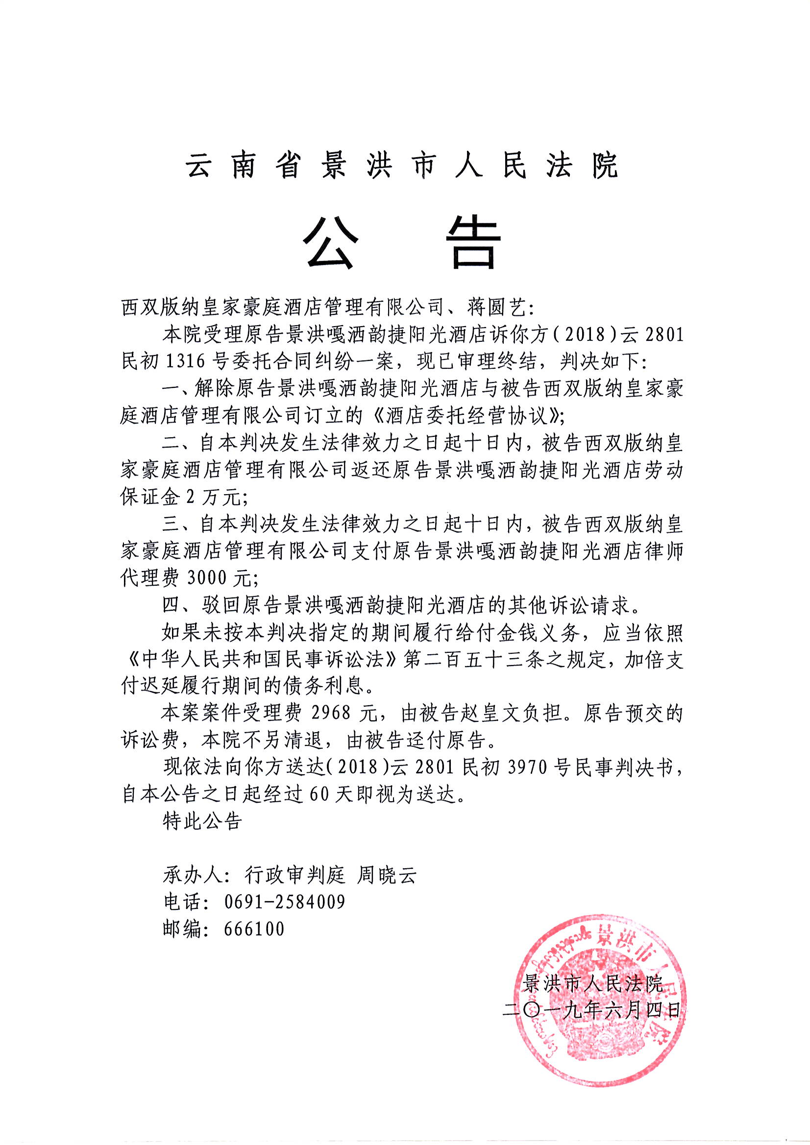 西双版纳皇家豪庭酒店管理有限公司、蒋圆艺(判决公告)