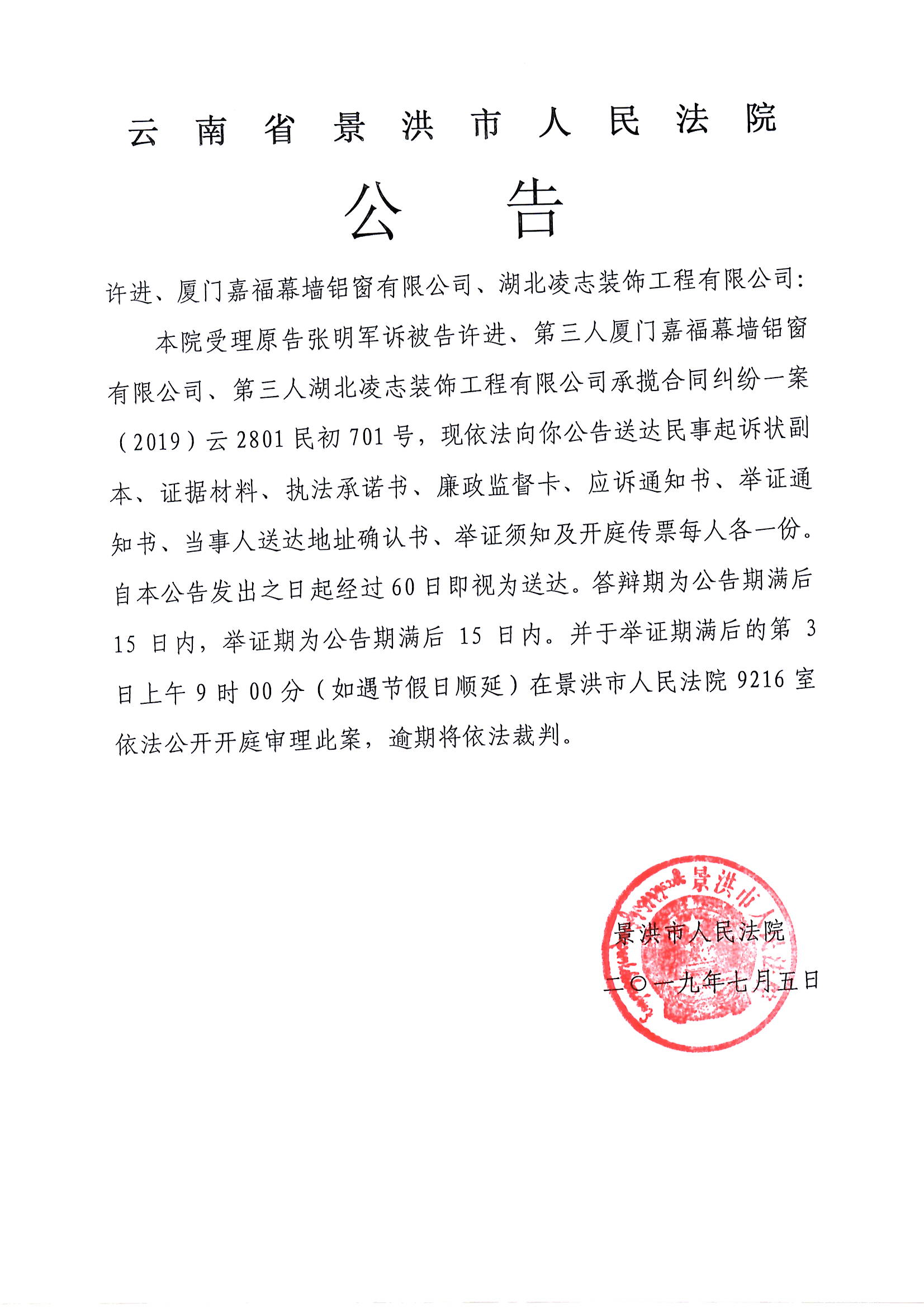 公告(许进、厦门嘉福幕墙铝窗有限公司、湖北凌志装饰工程有限公司)