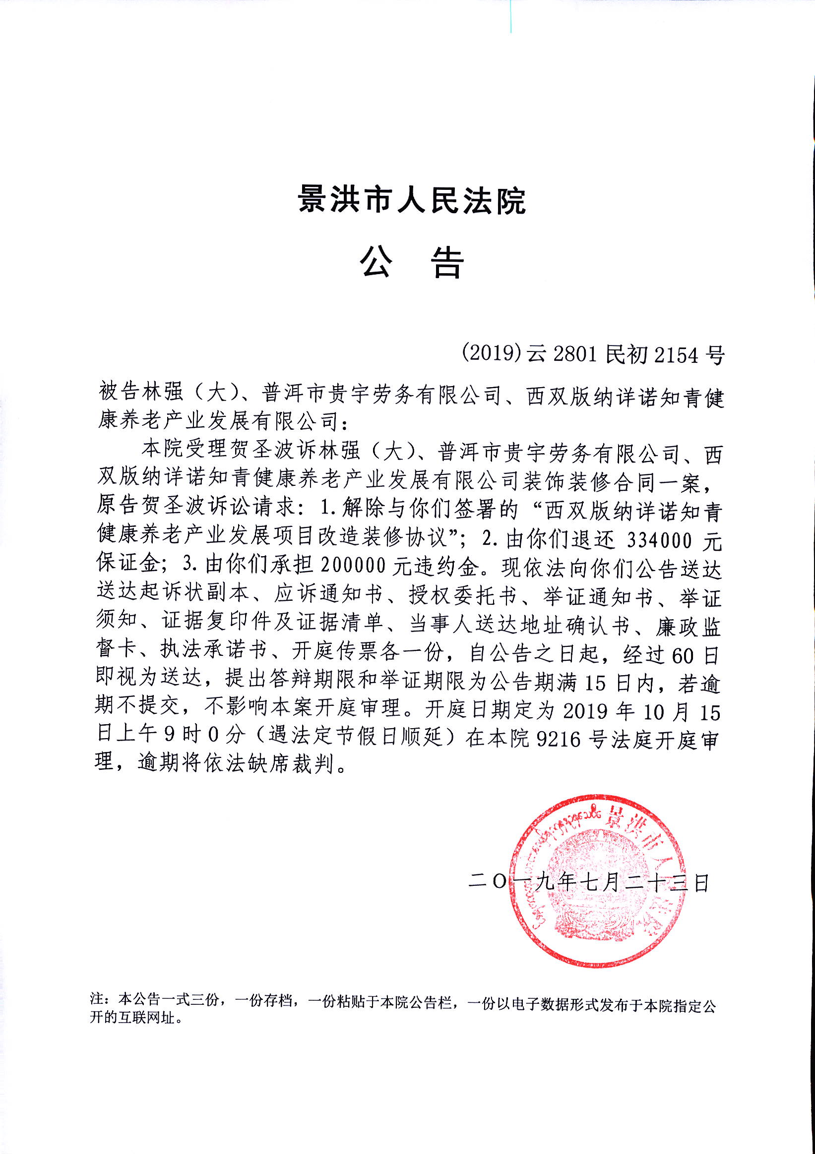 公告(林强、普洱市贵宇劳务有限公司、西双版纳详诺知青健康养老产业发展有限公司)