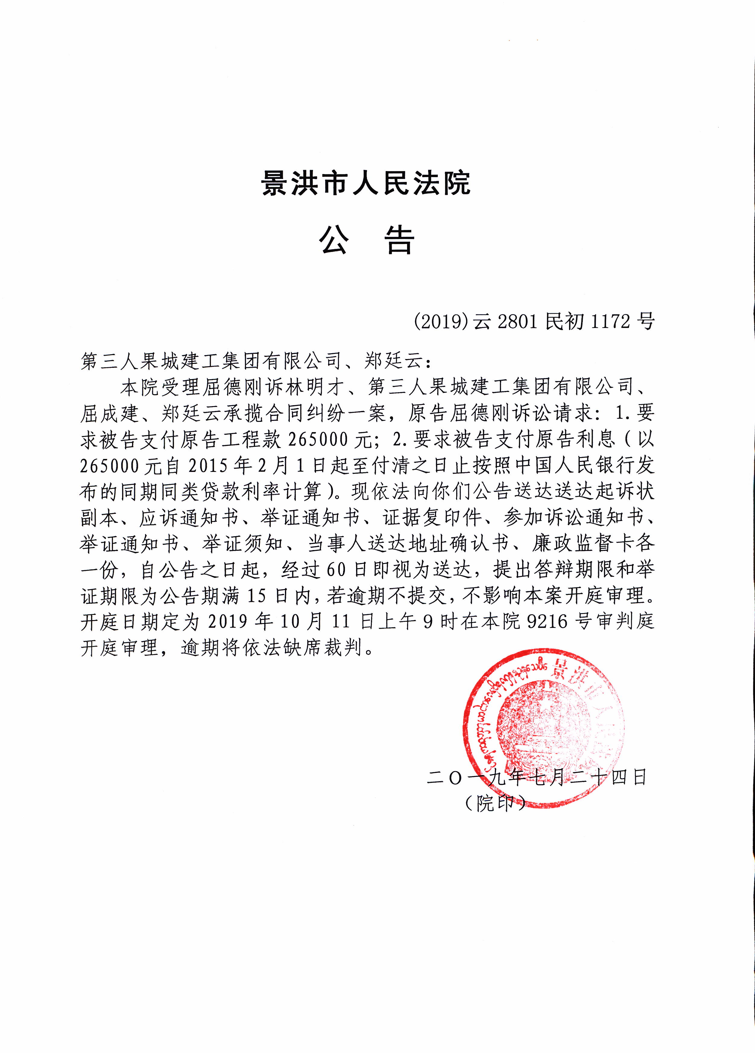 果城建工集团有限公司、郑廷云(公告传票)