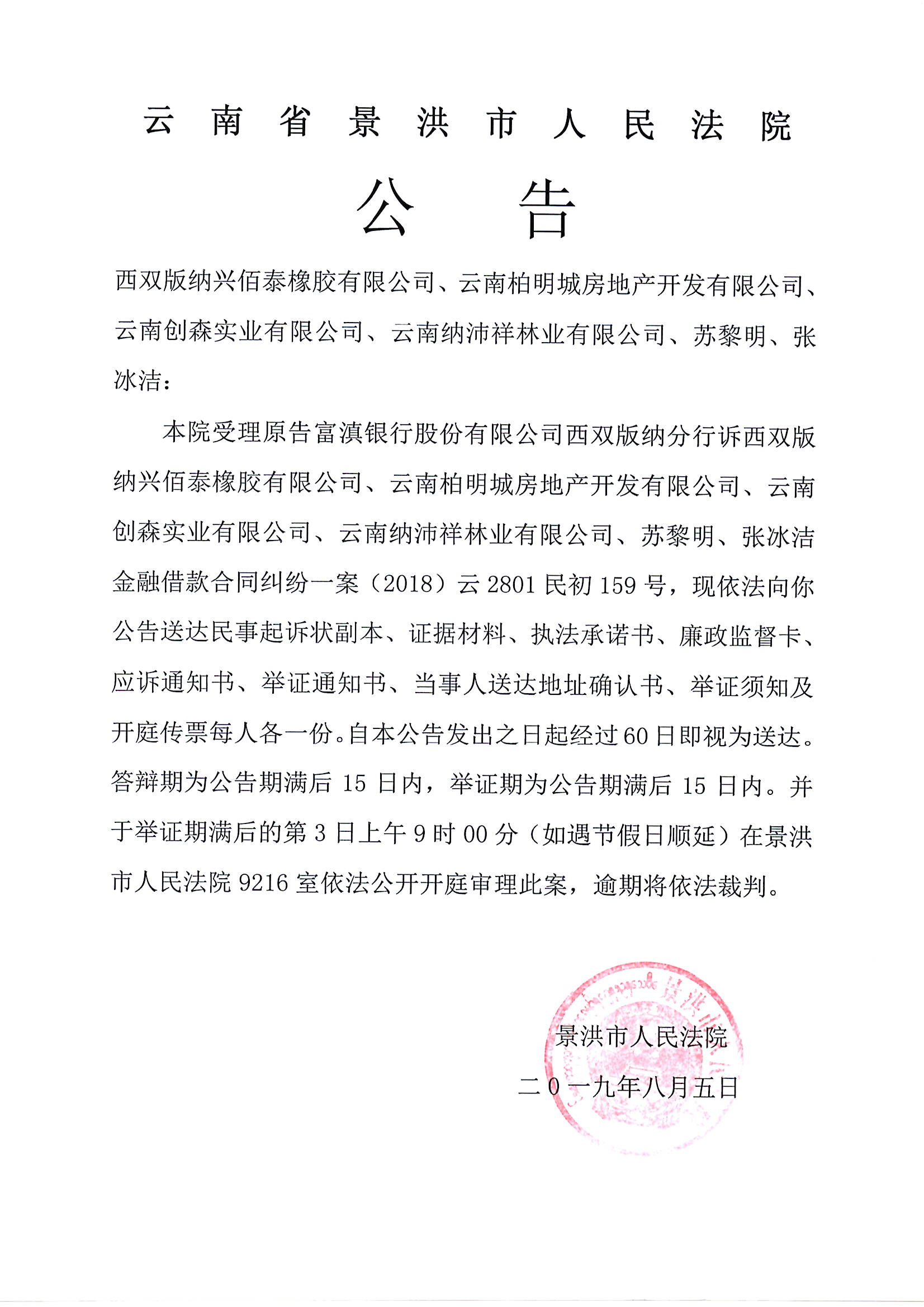 公告(西双版纳兴佰泰橡胶有限公司、云南柏明城房地产开发有限公司、云南创森实业有限公司、云南纳沛祥林业有限公司、苏黎明、张冰洁)