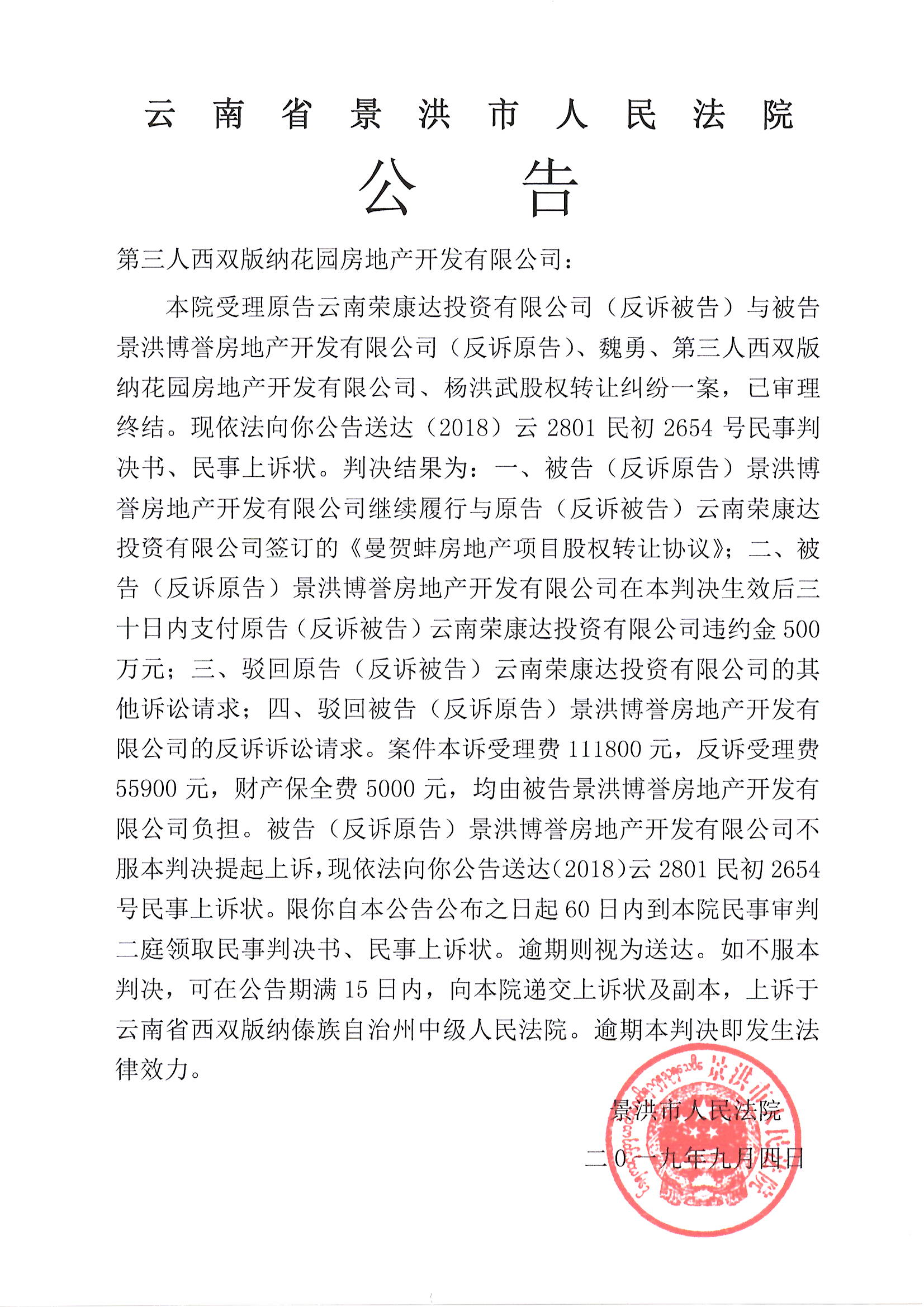 公告(西双版纳花园房地产开发有限公司)