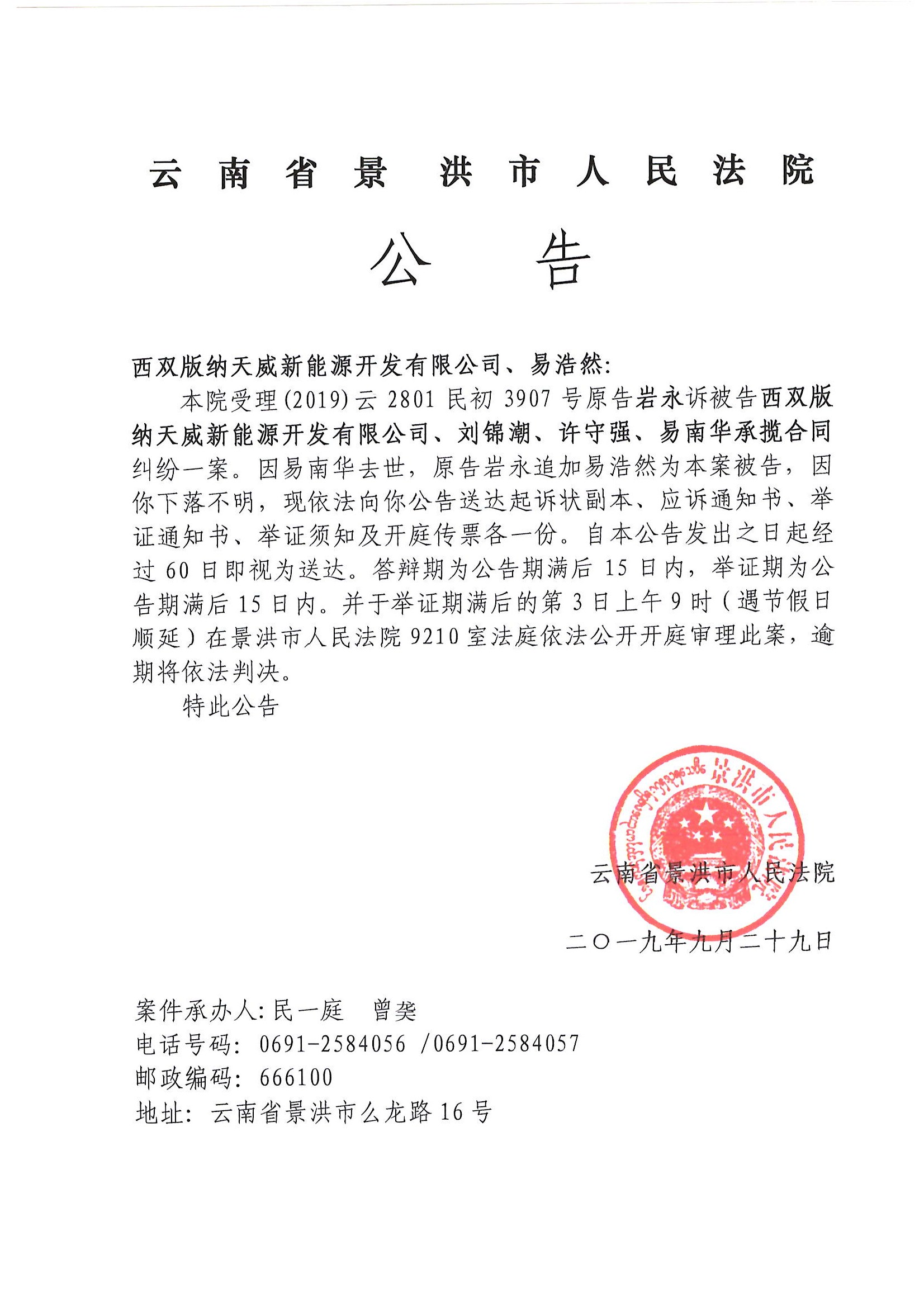 西双版纳天威新能源开发有限公司、易浩然传票公告