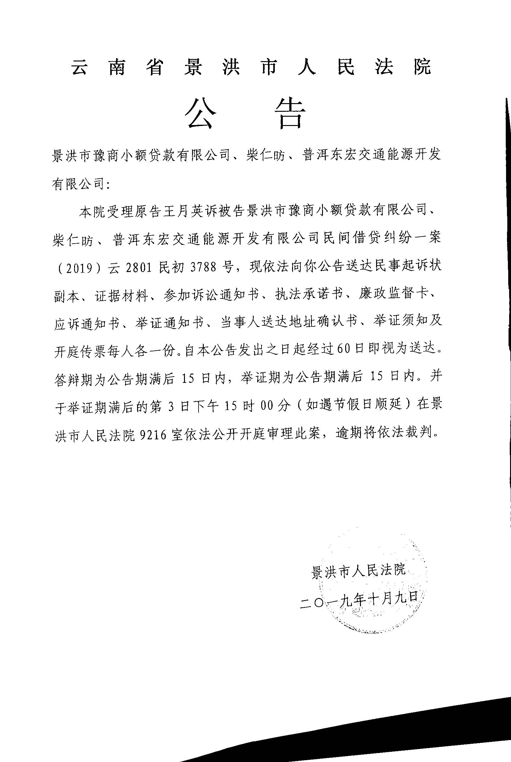 公告(景洪市豫商小额贷款有限公司、柴仁昉、普洱东宏交通能源开发有限公司)