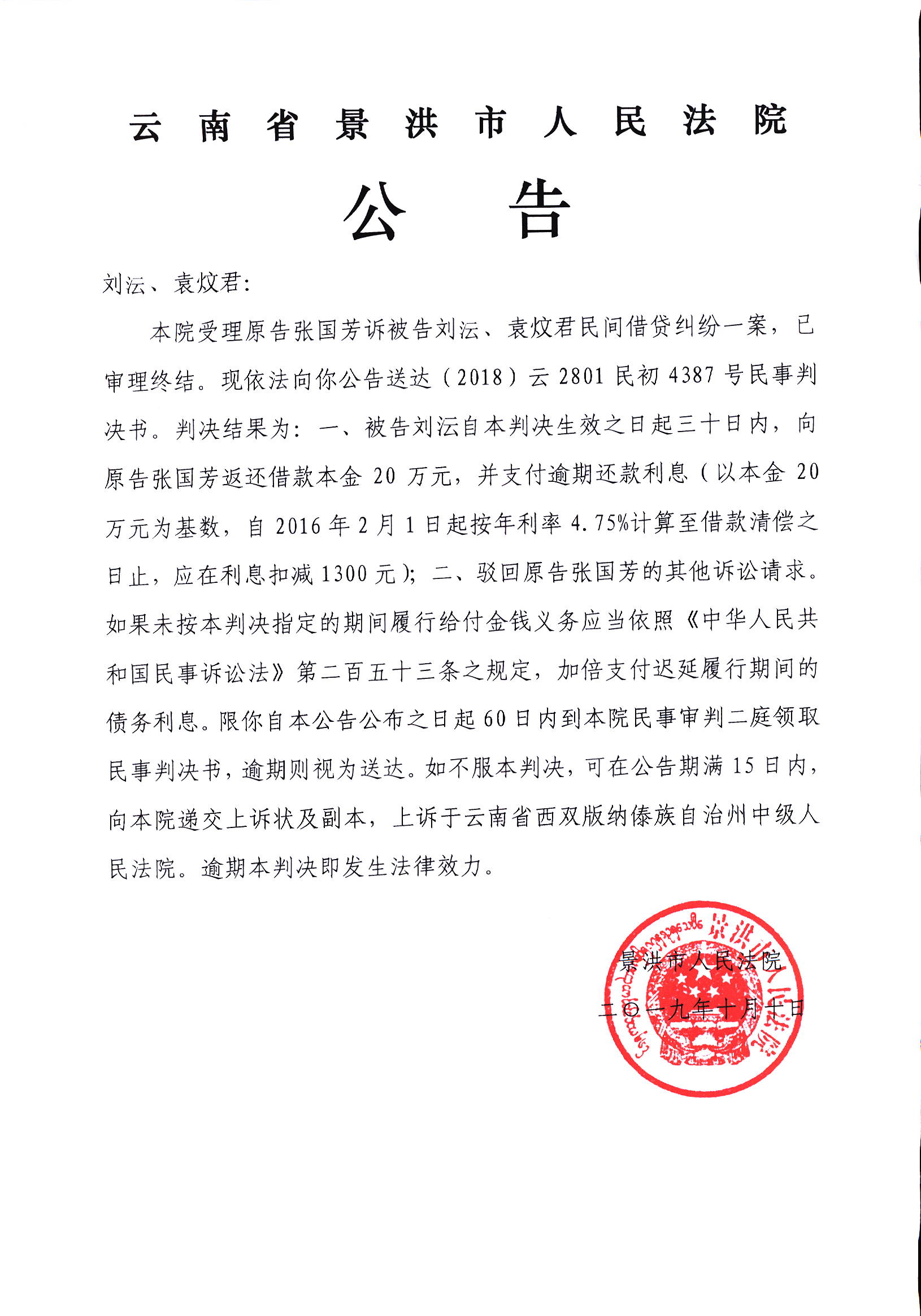 判决公告(2018)云2801民初4387号
