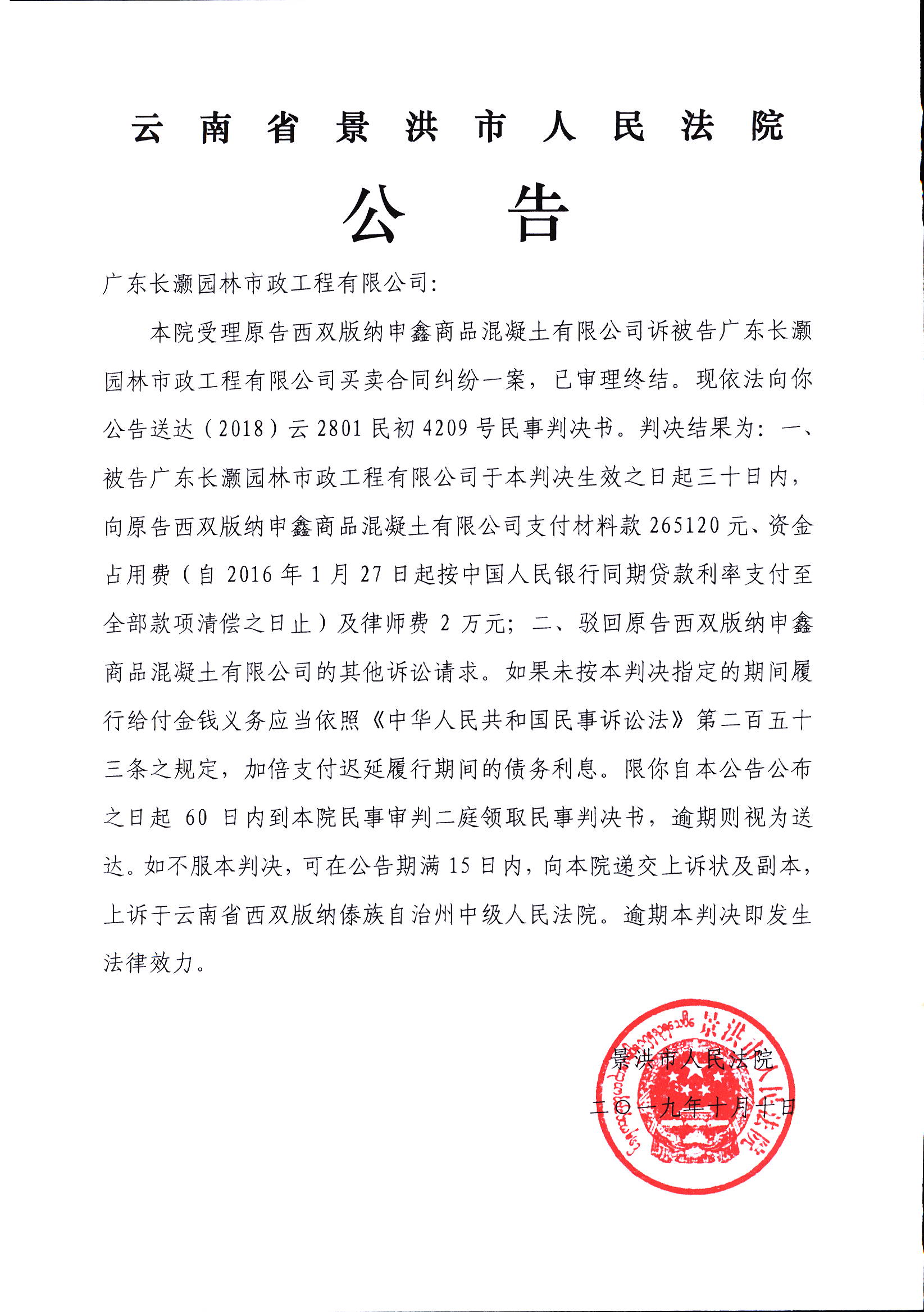 判决公告(2018)云2801民初4209号