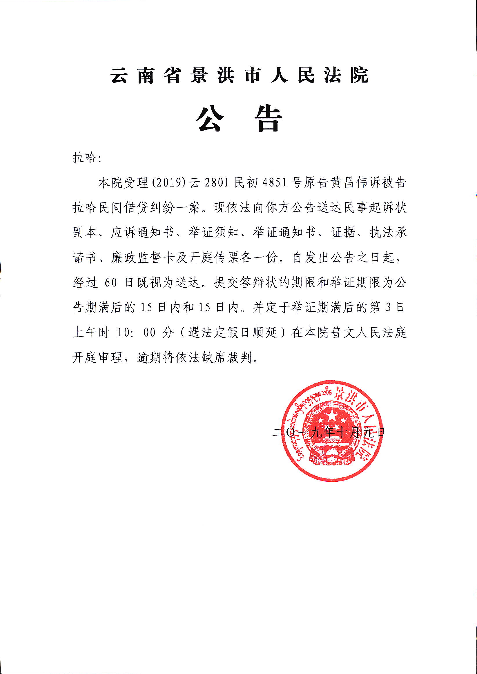 拉哈(公告开庭传票)