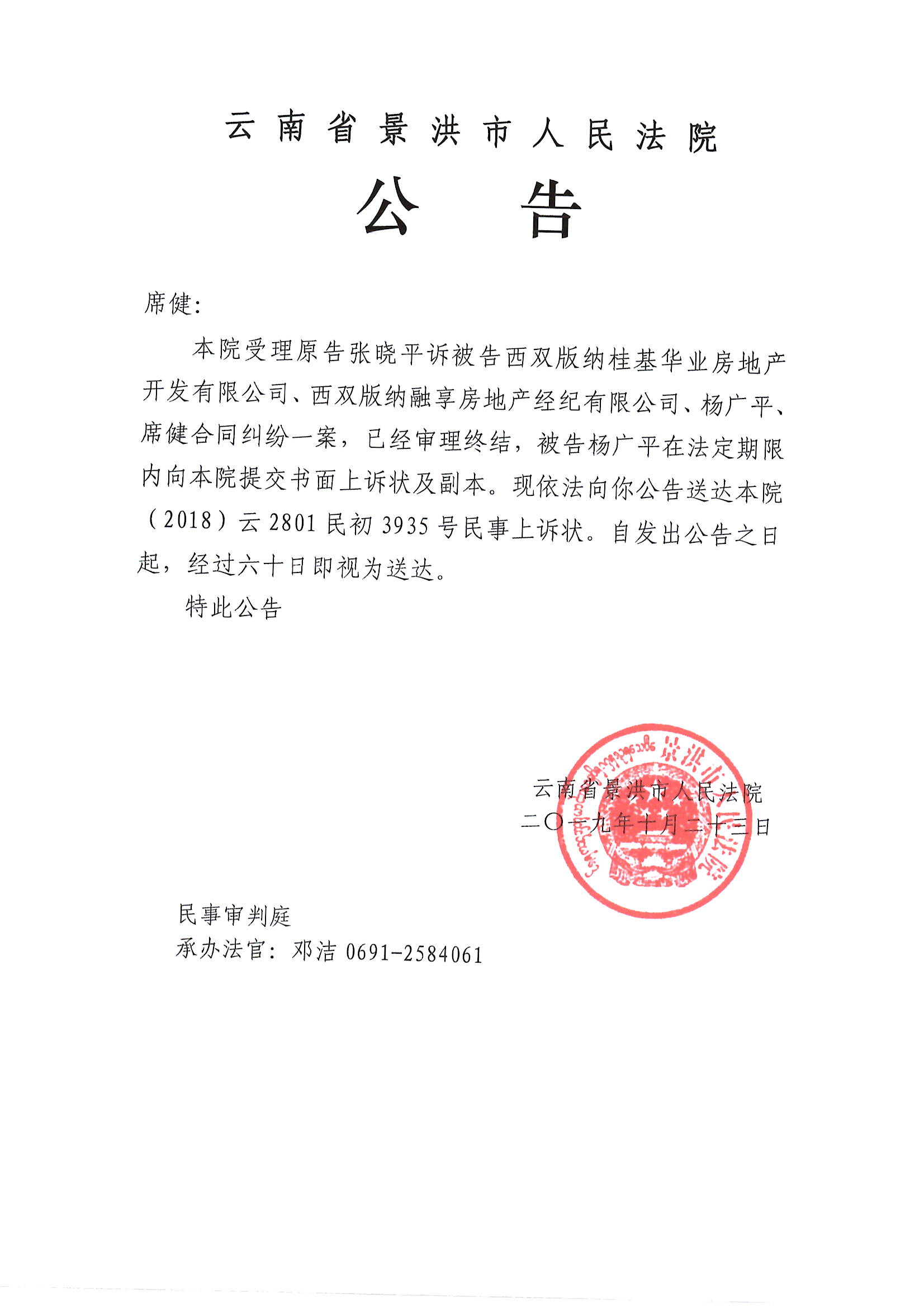 席健(公告上诉状,2018云2801民初3935号)