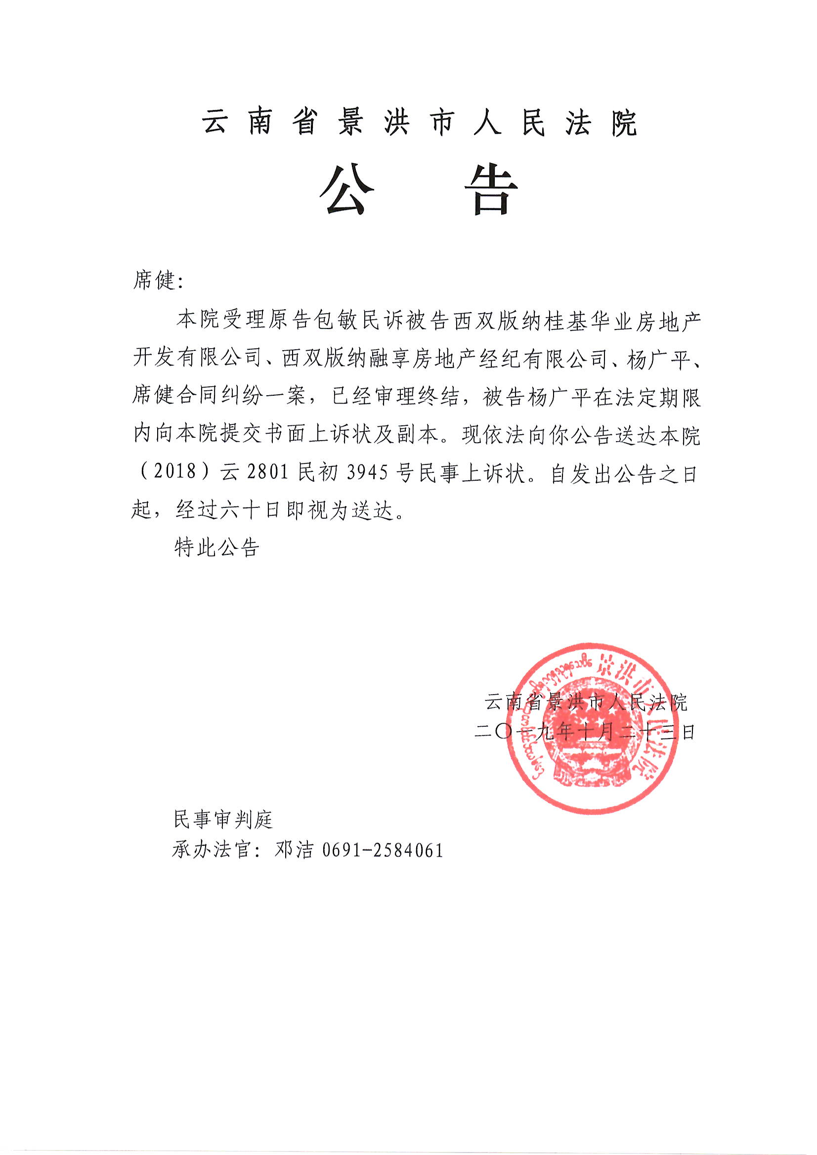席健( 公告上诉状,2018云2801民初3945号)