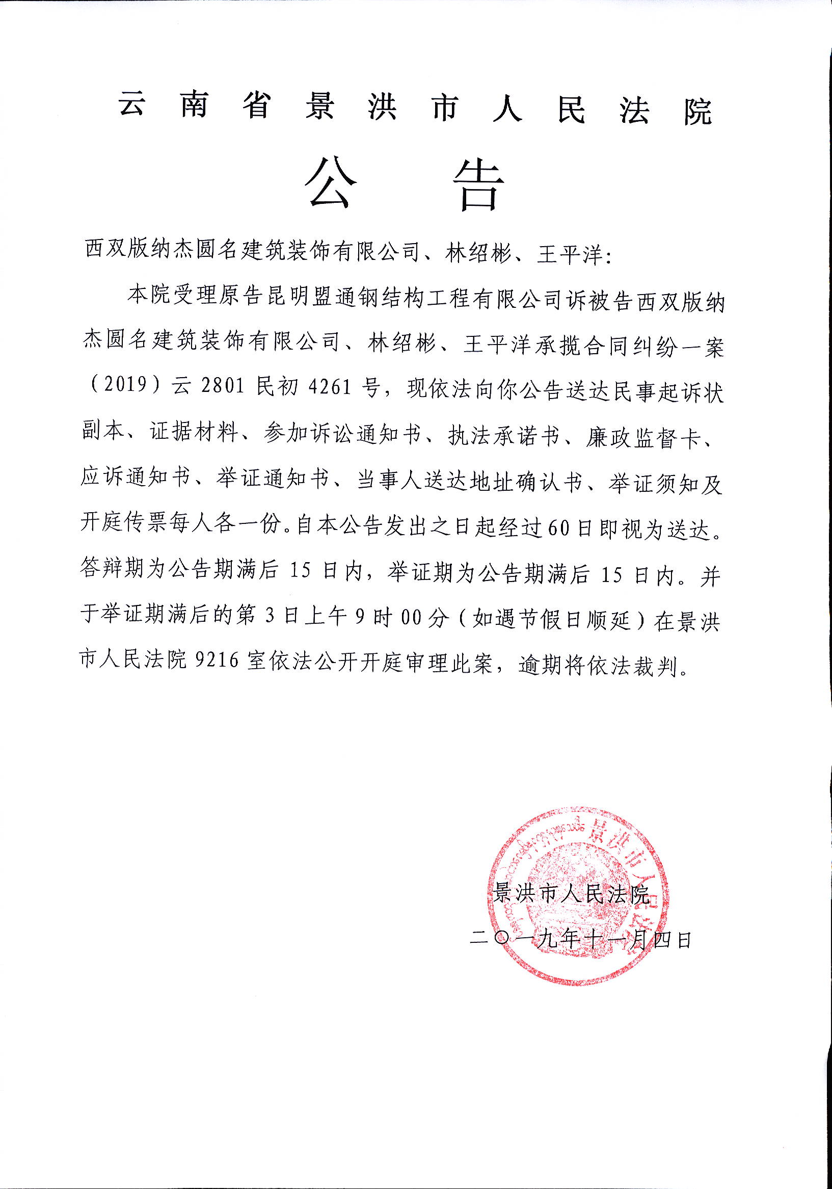 公告(西双版纳杰圆名建筑装饰有限公司、林绍彬、王平洋)