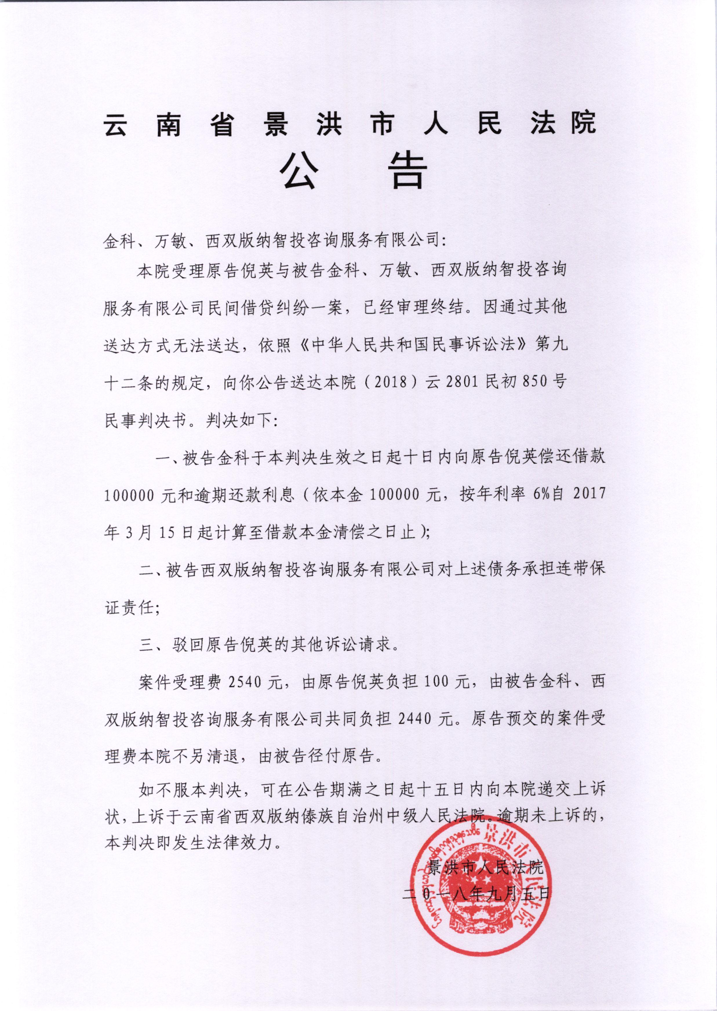 公告(金科、万敏、西双版纳智投咨询服务有限公司)