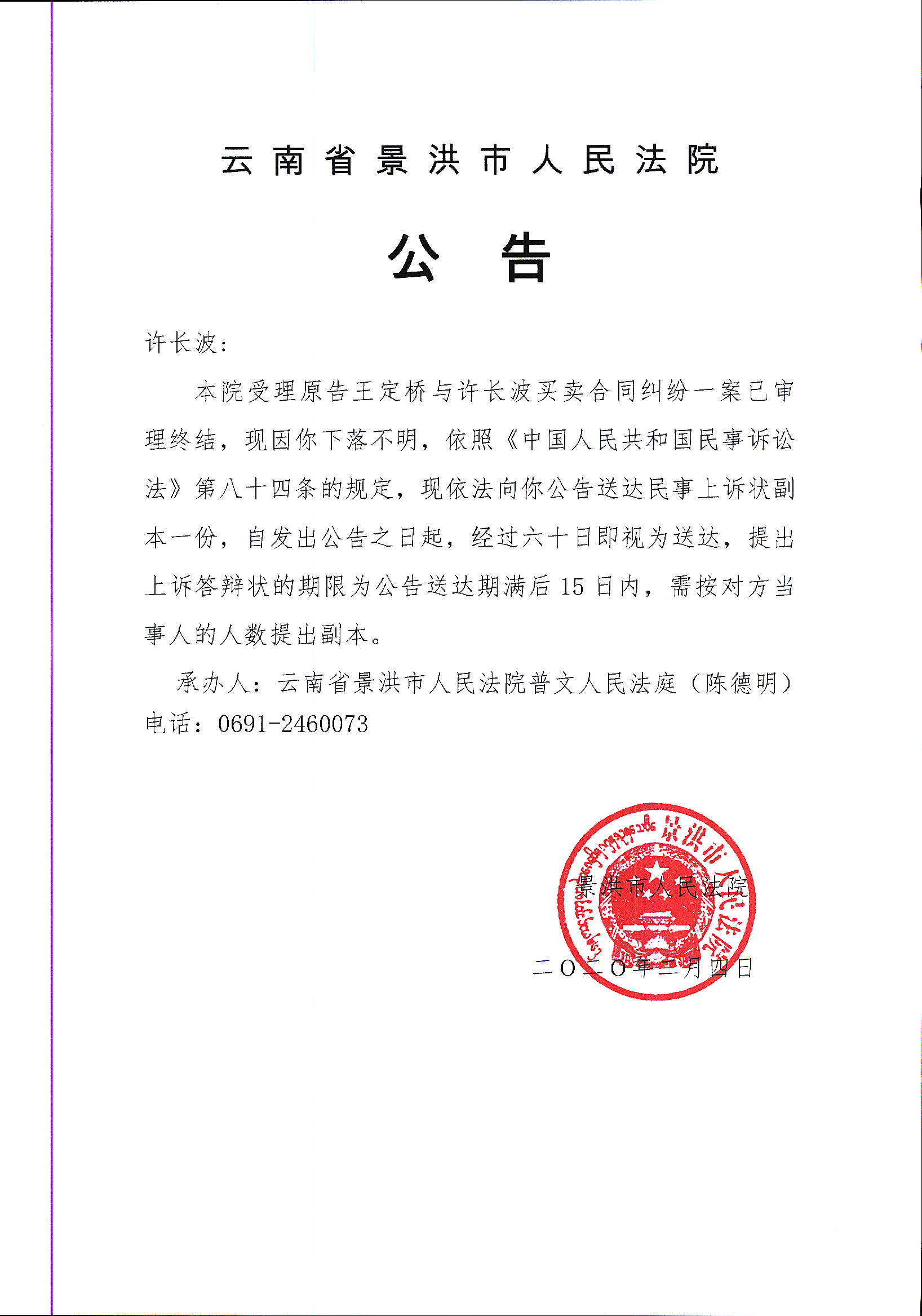 许长波(上诉公告)