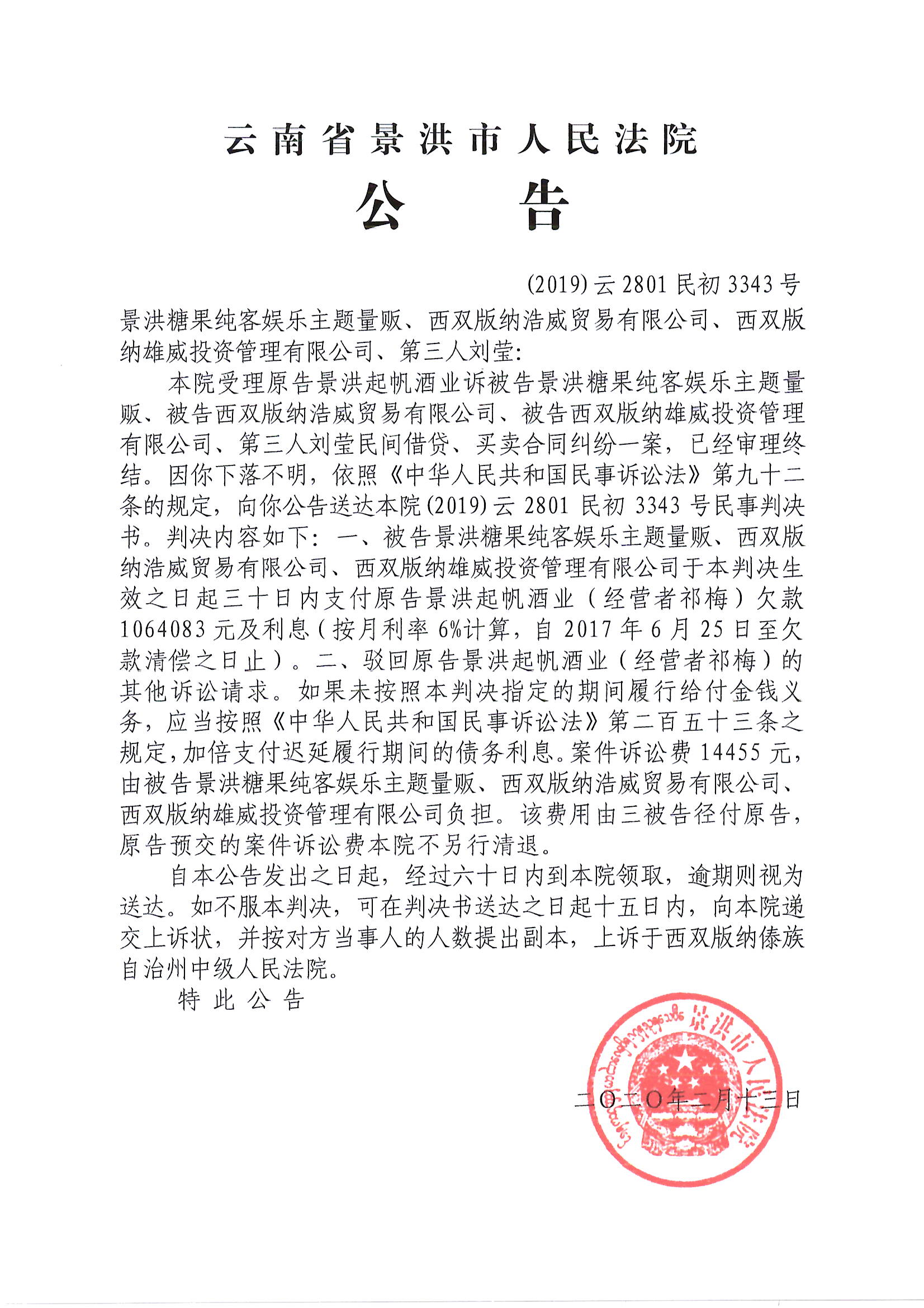 景洪糖果纯客娱乐主题量贩、西双版纳浩威贸易有限公司、西双版纳雄威投资管理有限公司、第三人刘莹(判决公告)