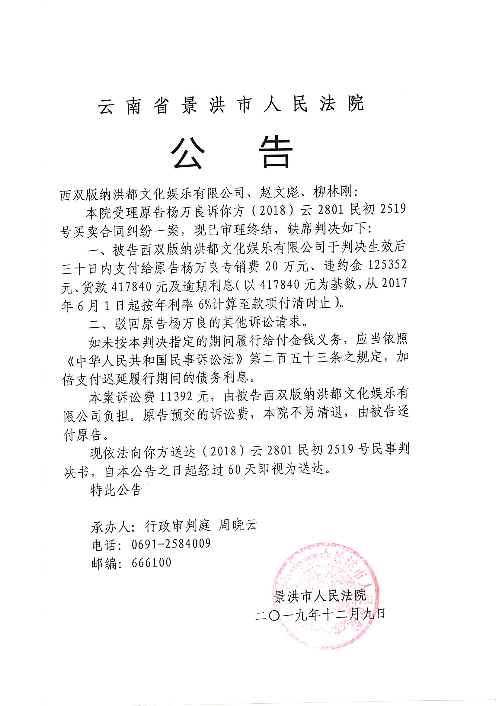 西双版纳洪都文化娱乐有限公司、赵文彪、柳林刚(判决公告)