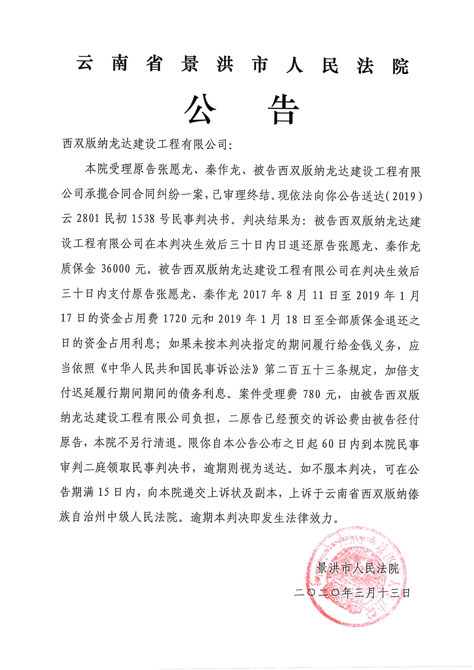 公告判决书(西双版纳龙达建设工程有限公司)