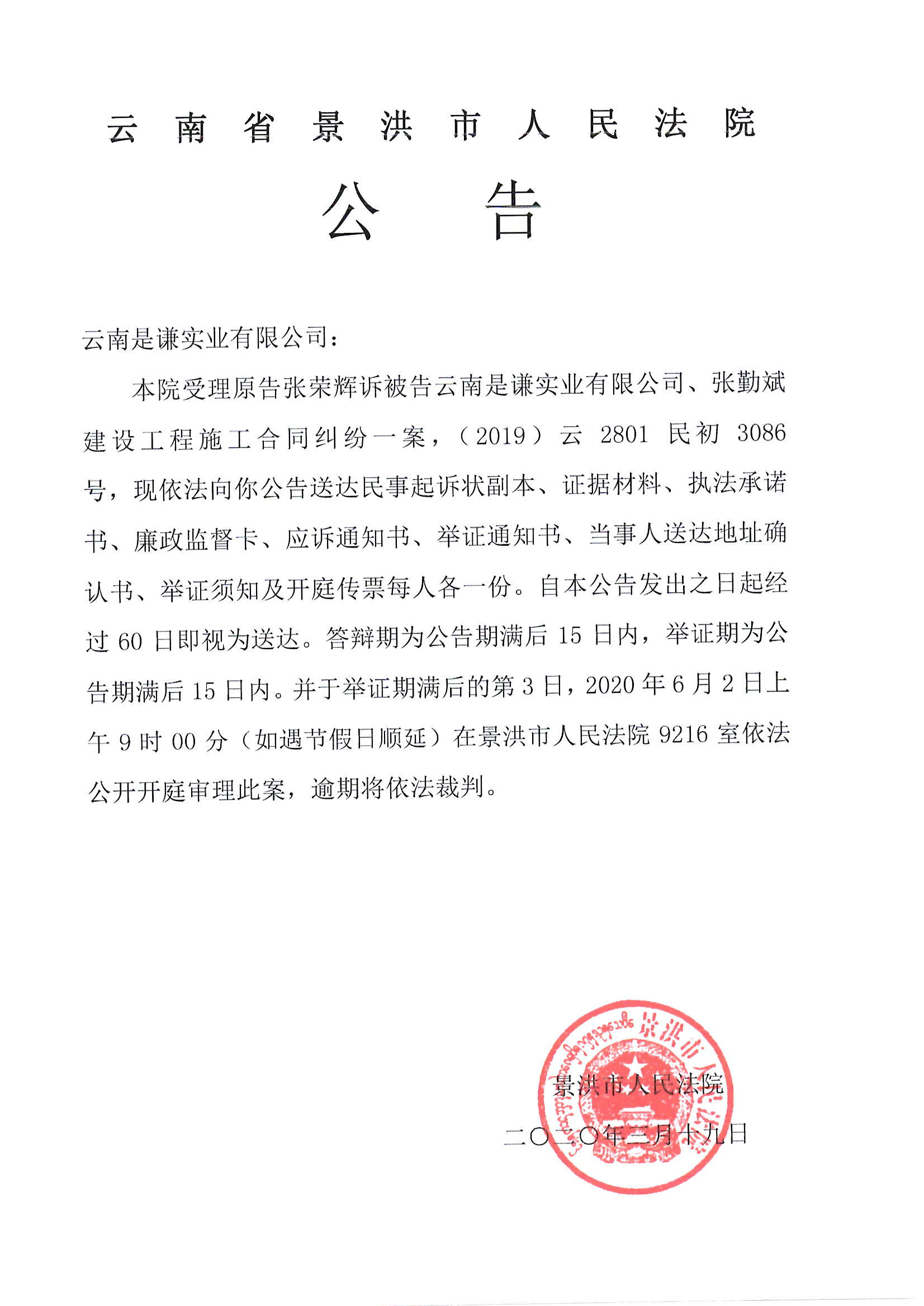 云南是谦实业有限公司(开庭公告)