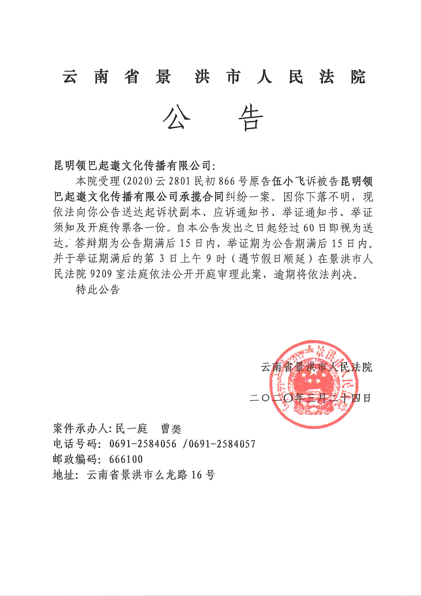 公告(昆明领巴起邀文化传播有限公司)