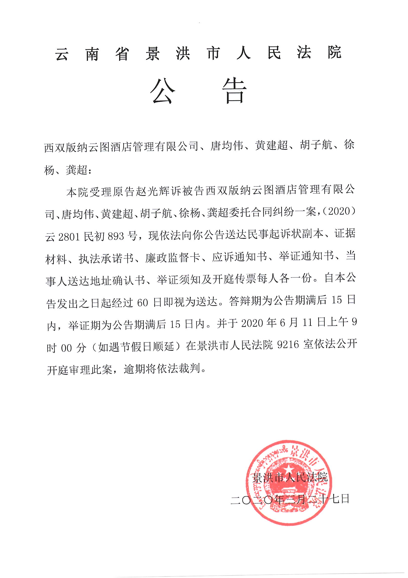 西双版纳云图酒店管理有限公司、唐均伟、黄建超、胡子航、徐杨、龚超(开庭公告)