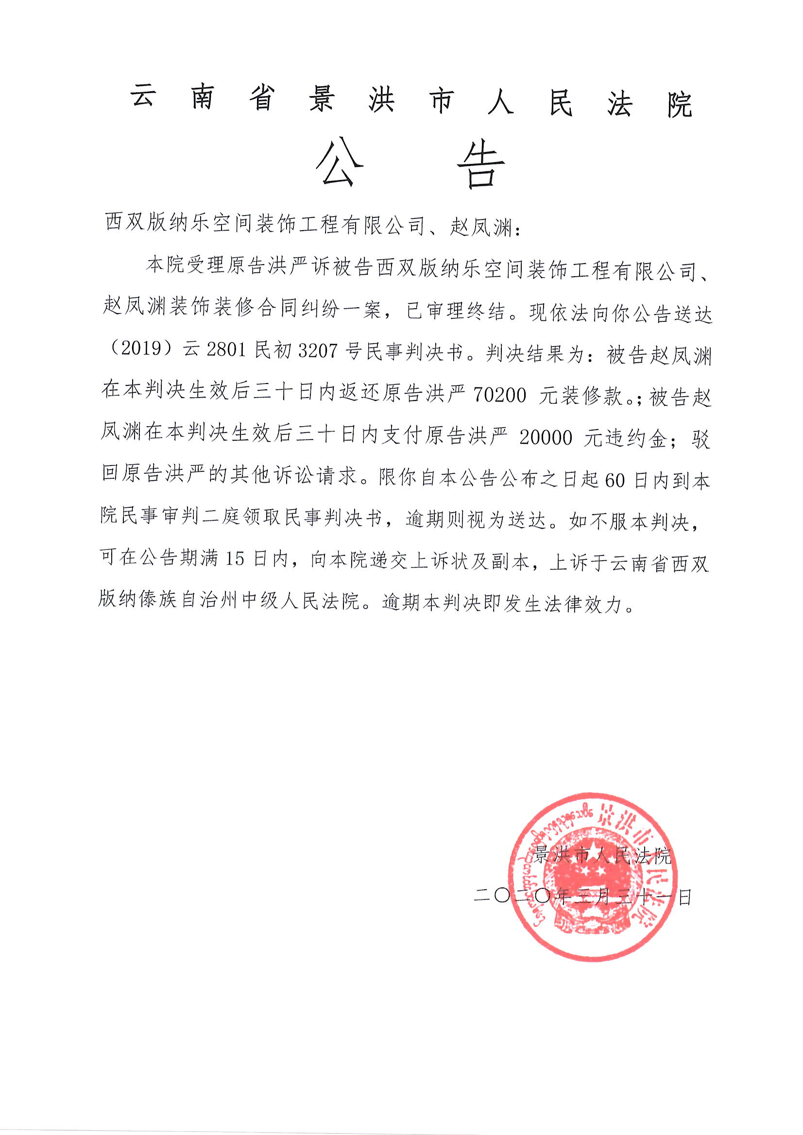 西双版纳乐空间装饰工程有限公司、赵凤渊(判决公告)