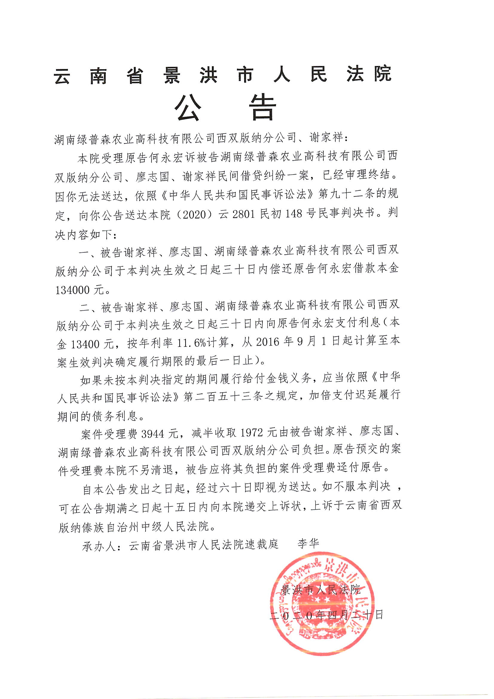 湖南绿普森农业高科技有限公司西双版纳分公司、谢家祥(公告判决)