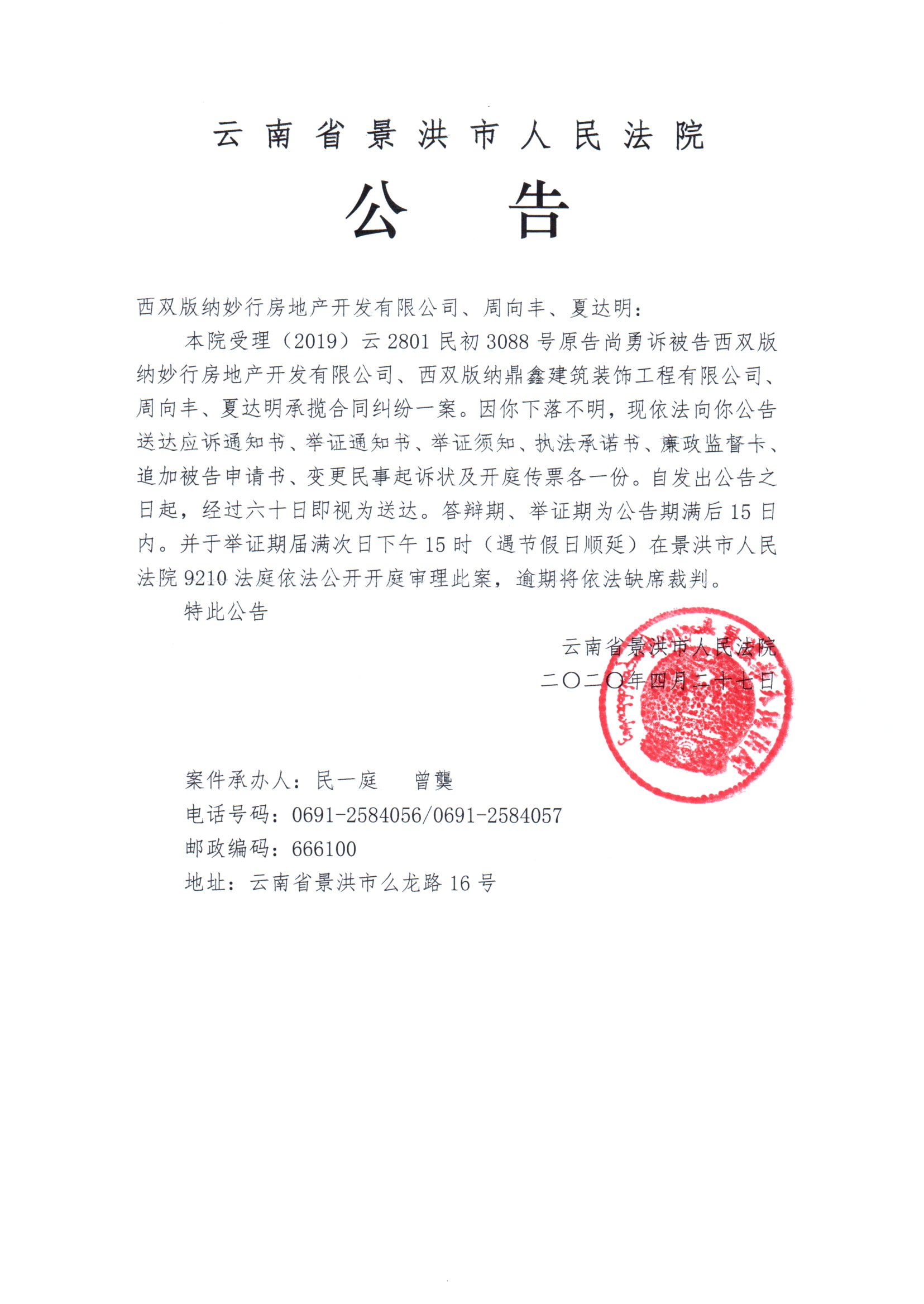 西双版纳妙行房地产开发有限公司、周向丰、夏达明公告