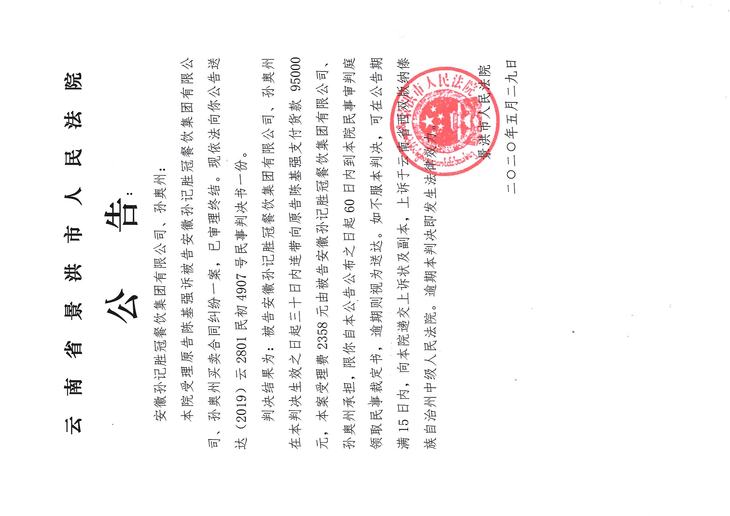 安徽孙记胜冠餐饮集团有限公司、孙奥洲公告判决