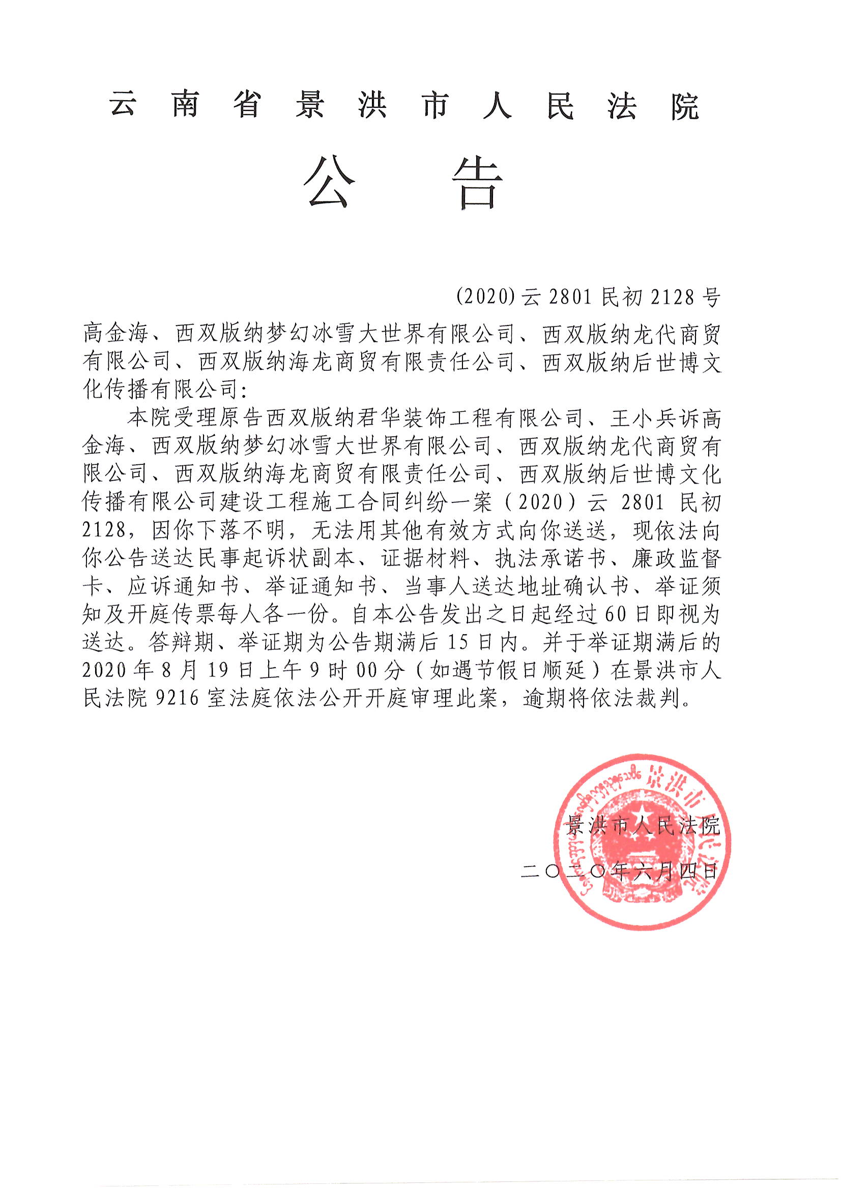 高金海、西双版纳梦幻冰雪大世界有限公司、西双版纳龙代商贸有限公司、西双版纳海龙商贸有限责任公司、西双版纳后世博文化传播有限公司(开庭公告)