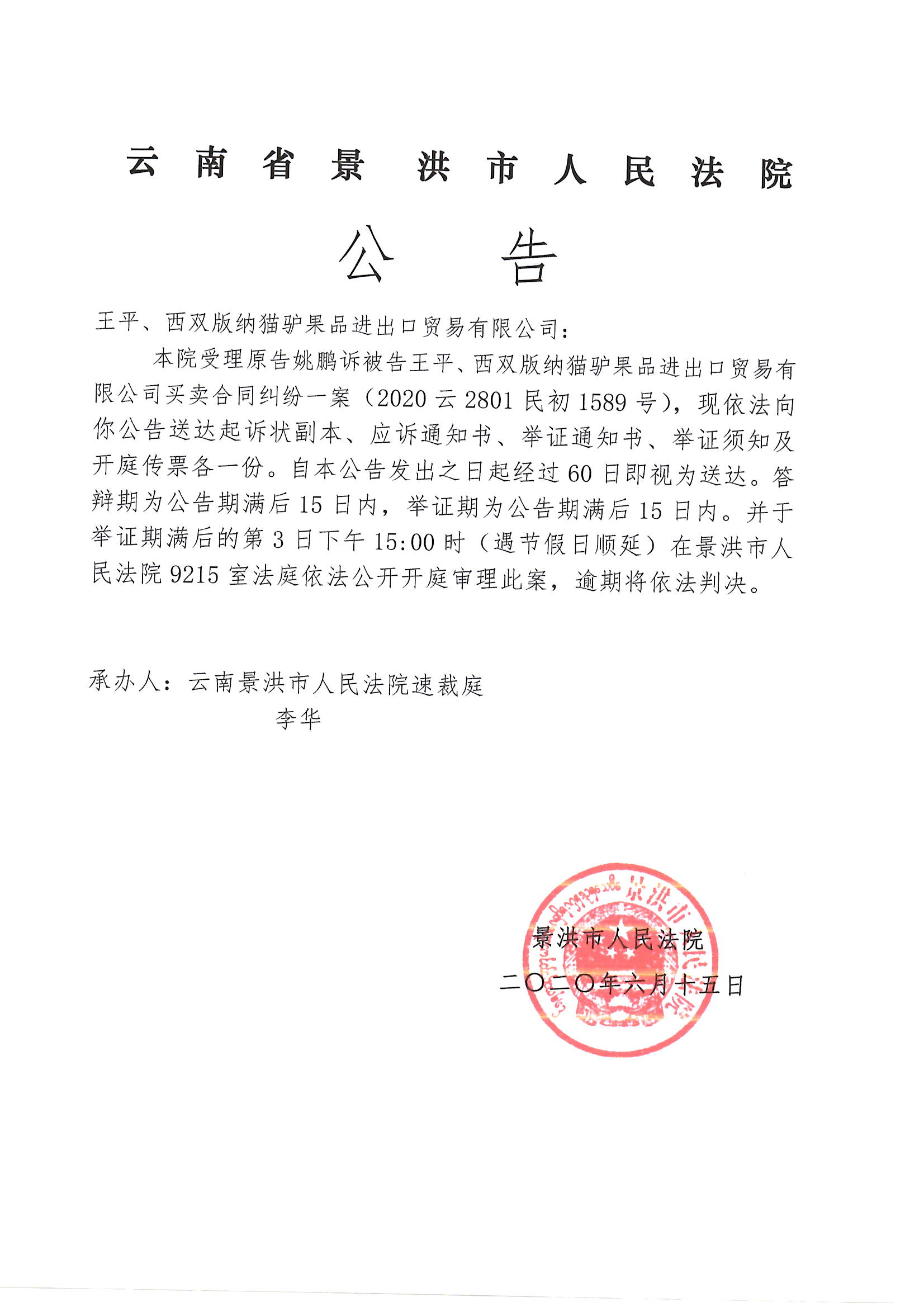 王平、西双版纳猫驴果品进出口贸易有限公司