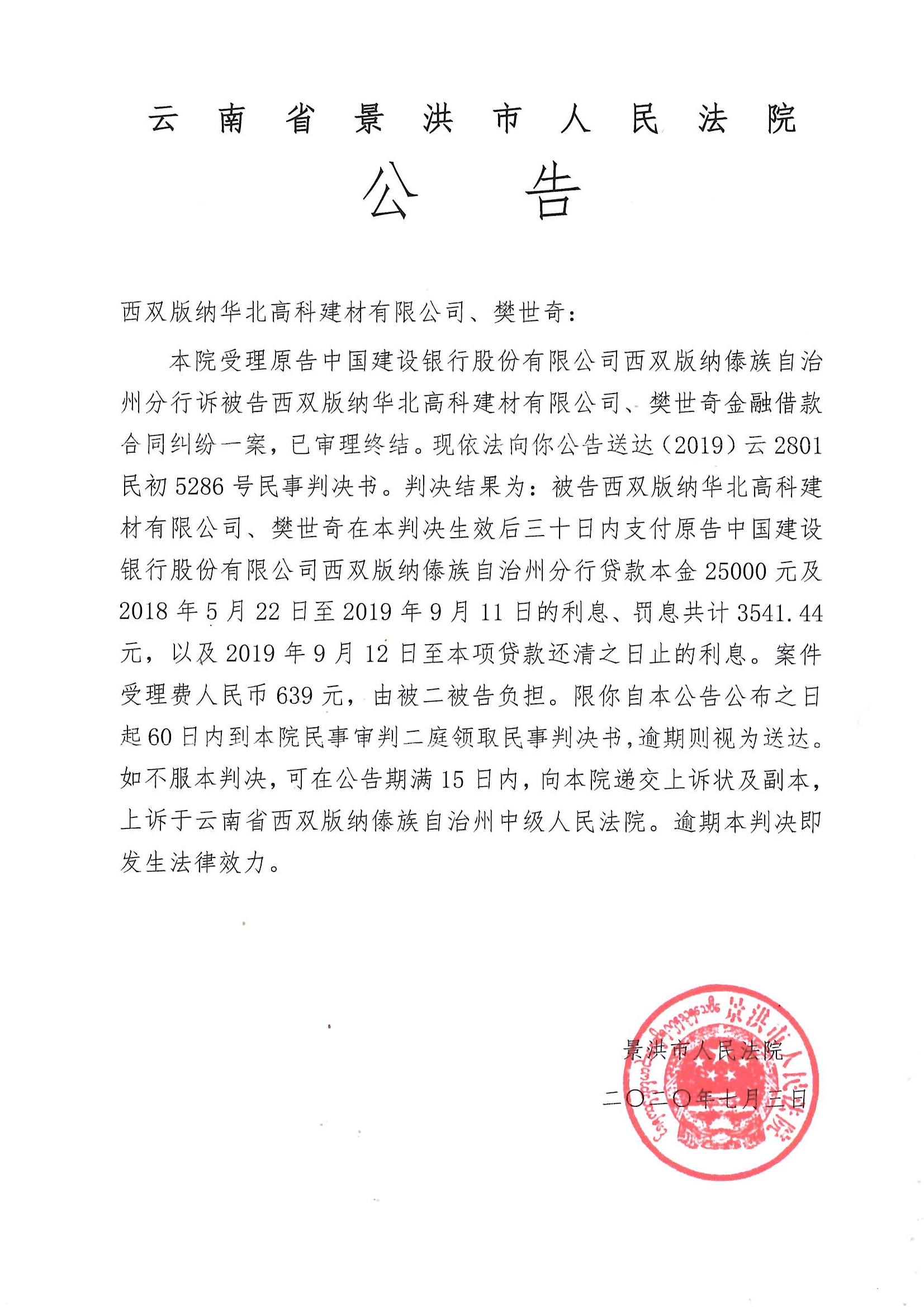 西双版纳华北高科建材有限公司、樊世奇公告判决