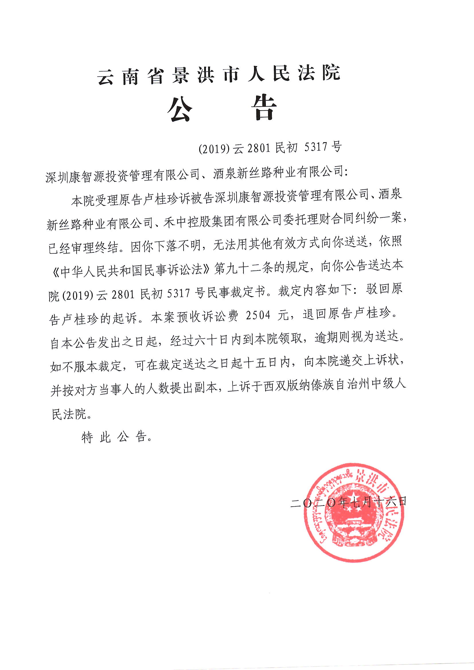 深圳康智源投资管理有限公司、酒泉新丝路种业有限公司