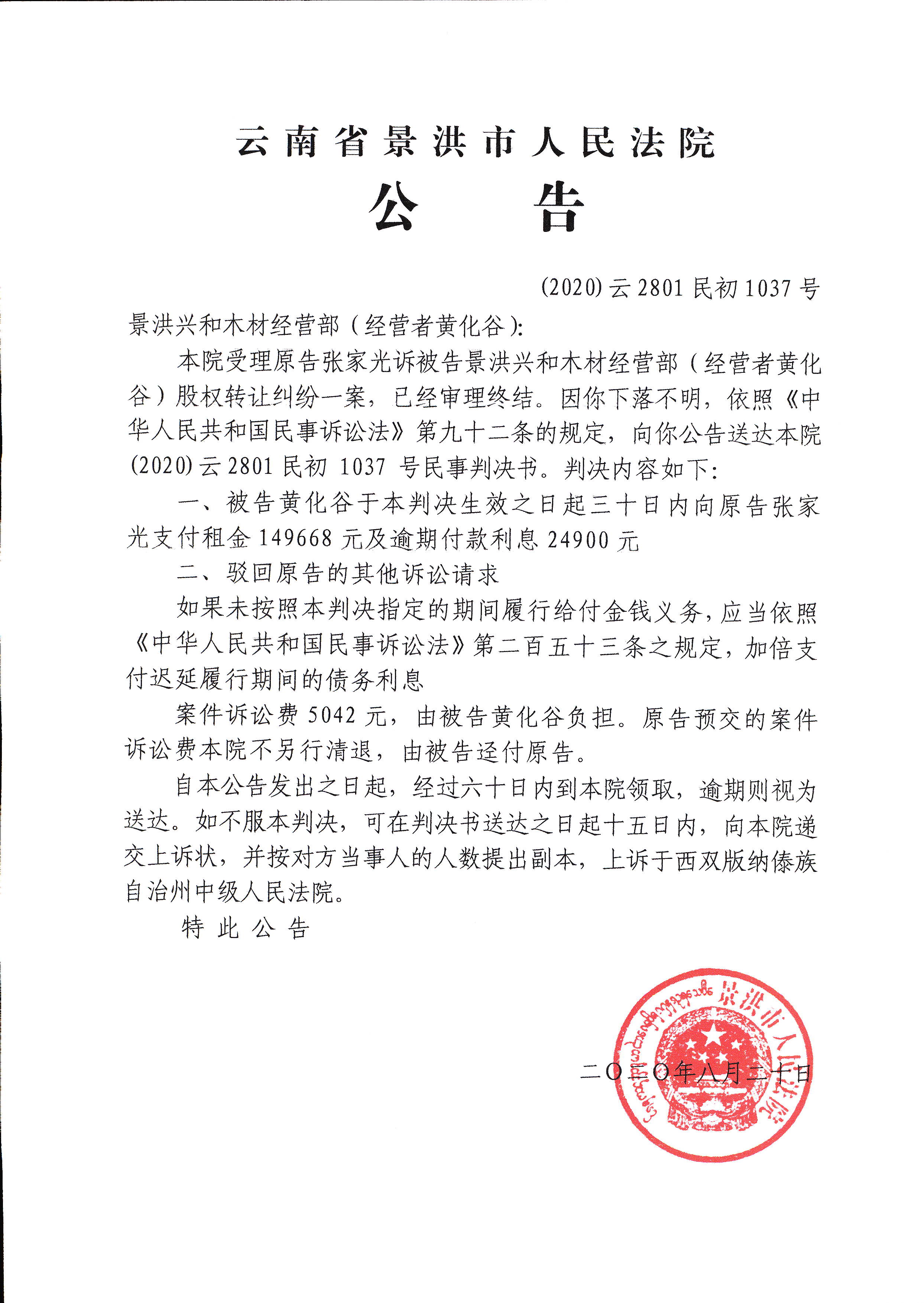 景洪兴和木材经营部(经营者黄化谷)(判决公告)