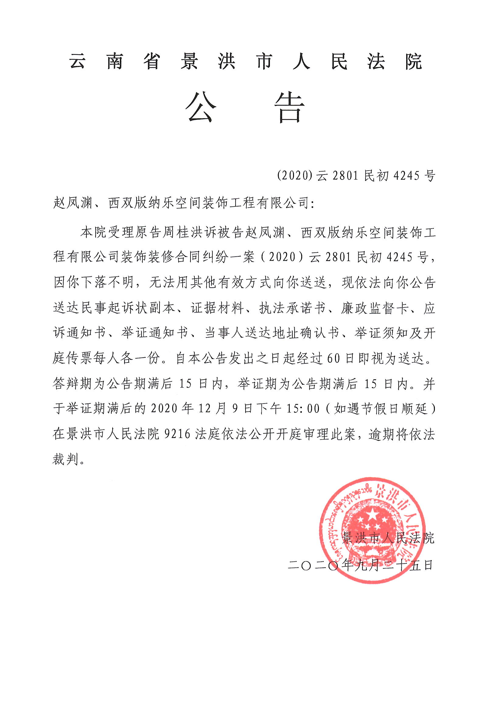 赵凤渊、西双版纳乐空间装饰工程有限公司(开庭公告)
