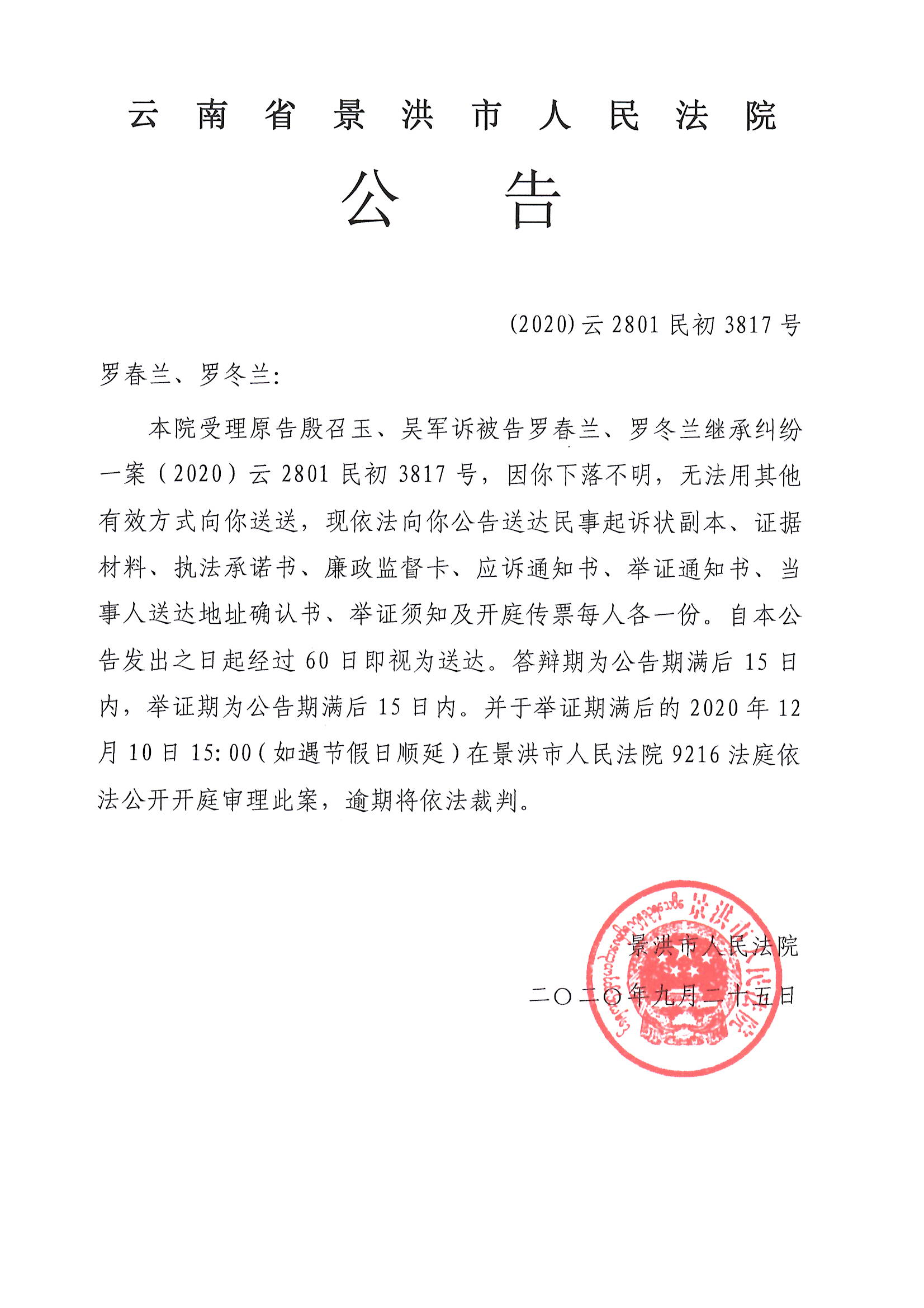 罗春兰、罗冬兰(开庭公告)