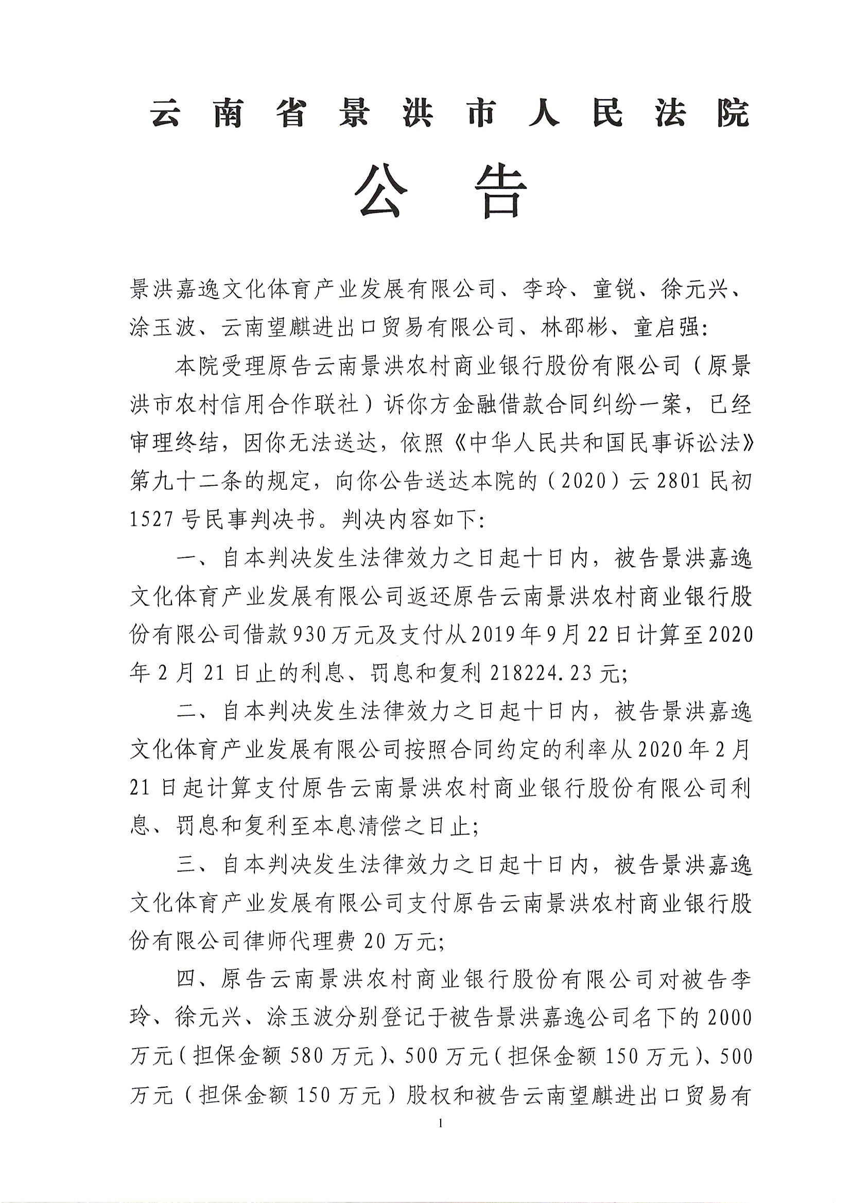 景洪嘉逸文化体育产业发展有限公司(判决公告)1527号