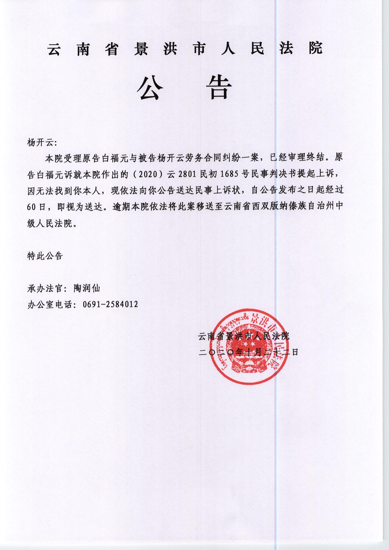 杨云开上诉状公告