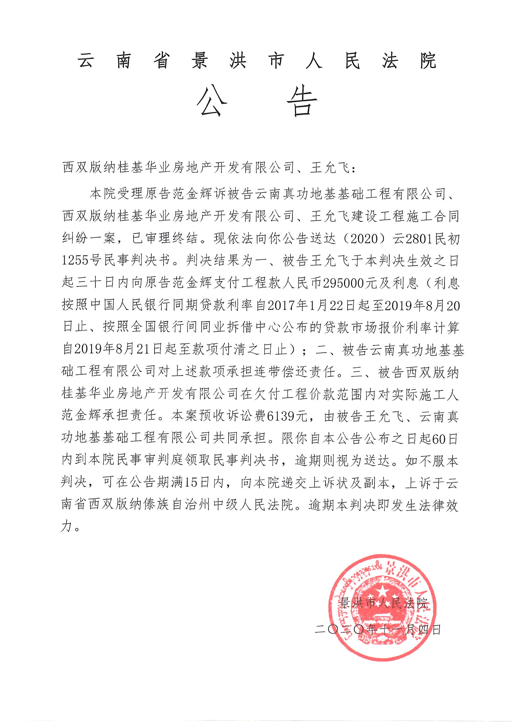 西双版纳桂基华业房地产开发有限公司、王允飞(开庭公告)